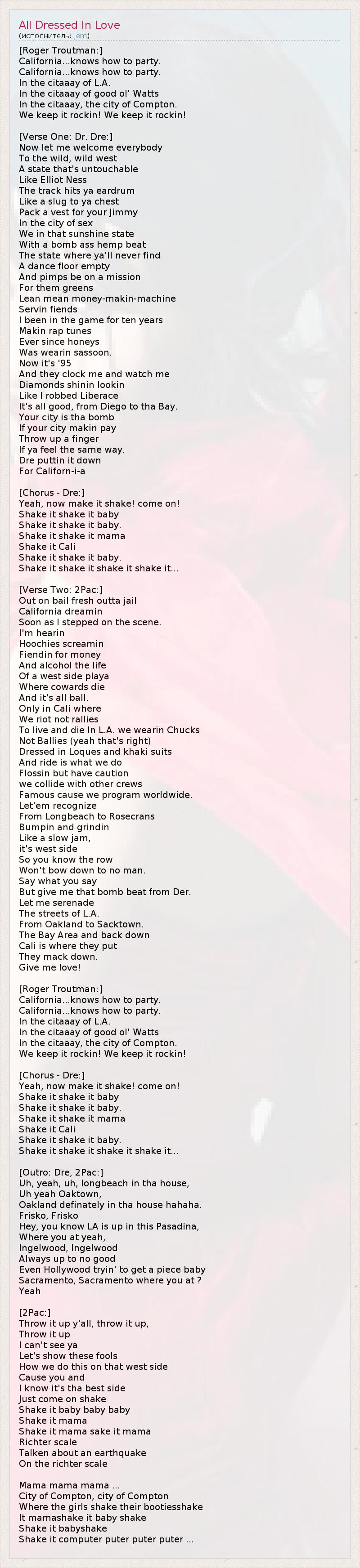 [Roger Troutman:] California...knows how to party. California...knows how to party. In the citaaay of L.A. In the citaaay of good ol' Watts In the citaaay, the city of Compton. We keep it rockin! We keep it rockin! [Verse One: Dr. Dre:] Now let me welcome everybody To the wild, wild west A state that's untouchable Like Elliot Ness The track hits ya eardrum Like a slug to ya chest Pack a vest for your Jimmy In the city of sex We in that sunshine state With a bomb ass hemp beat The state where ya'll never find A dance floor empty And pimps be on a mission For them greens Lean mean money-makin-machine Servin fiends I been in the game for ten years Makin rap tunes Ever since honeys Was wearin sassoon. Now it's '95 And they clock me and watch me Diamonds shinin lookin Like I robbed Liberace It's all good, from Diego to tha Bay. Your city is tha bomb If your city makin pay Throw up a finger If ya feel the same way. Dre puttin it down For Californ-i-a [Chorus - Dre:] Yeah, now make it shake! come on! Shake it shake it baby Shake it shake it baby. Shake it shake it mama Shake it Cali Shake it shake it baby. Shake it shake it shake it shake it... [Verse Two: 2Pac:] Out on bail fresh outta jail California dreamin Soon as I stepped on the scene. I'm hearin Hoochies screamin Fiendin for money And alcohol the life Of a west side playa Where cowards die And it's all ball. Only in Cali where We riot not rallies To live and die In L.A. we wearin Chucks Not Ballies (yeah that's right) Dressed in Loques and khaki suits And ride is what we do Flossin but have caution we collide with other crews Famous cause we program worldwide. Let'em recognize From Longbeach to Rosecrans Bumpin and grindin Like a slow jam, it's west side So you know the row Won't bow down to no man. Say what you say But give me that bomb beat from Der. Let me serenade The streets of L.A. From Oakland to Sacktown. The Bay Area and back down Cali is where they put They mack down. Give me love! [Roger Troutman:] California...knows how to party. California...knows how to party. In the citaaay of L.A. In the citaaay of good ol' Watts In the citaaay, the city of Compton. We keep it rockin! We keep it rockin! [Chorus - Dre:] Yeah, now make it shake! come on! Shake it shake it baby Shake it shake it baby. Shake it shake it mama Shake it Cali Shake it shake it baby. Shake it shake it shake it shake it... [Outro: Dre, 2Pac:] Uh, yeah, uh, longbeach in tha house, Uh yeah Oaktown, Oakland definately in tha house hahaha. Frisko, Frisko Hey, you know LA is up in this Pasadina, Where you at yeah, Ingelwood, Ingelwood Always up to no good Even Hollywood tryin' to get a piece baby Sacramento, Sacramento where you at ? Yeah [2Pac:] Throw it up y'all, throw it up, Throw it up I can't see ya Let's show these fools How we do this on that west side Cause you and I know it's tha best side Just come on shake Shake it baby baby baby Shake it mama Shake it mama sake it mama Richter scale Talken about an earthquake On the richter scale Mama mama mama ... City of Compton, city of Compton Where the girls shake their bootiesshake It mamashake it baby shake Shake it babyshake Shake it computer puter puter puter ...