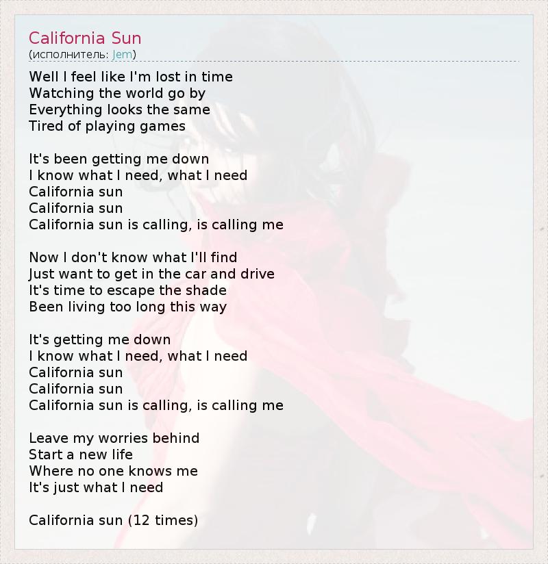 Well I feel like I'm lost in time Watching the world go by Everything looks the same Tired of playing games It's been getting me down I know what I need, what I need California sun California sun California sun is calling, is calling me Now I don't know what I'll find Just want to get in the car and drive It's time to escape the shade Been living too long this way It's getting me down I know what I need, what I need California sun California sun California sun is calling, is calling me Leave my worries behind Start a new life Where no one knows me It's just what I need California sun (12 times)