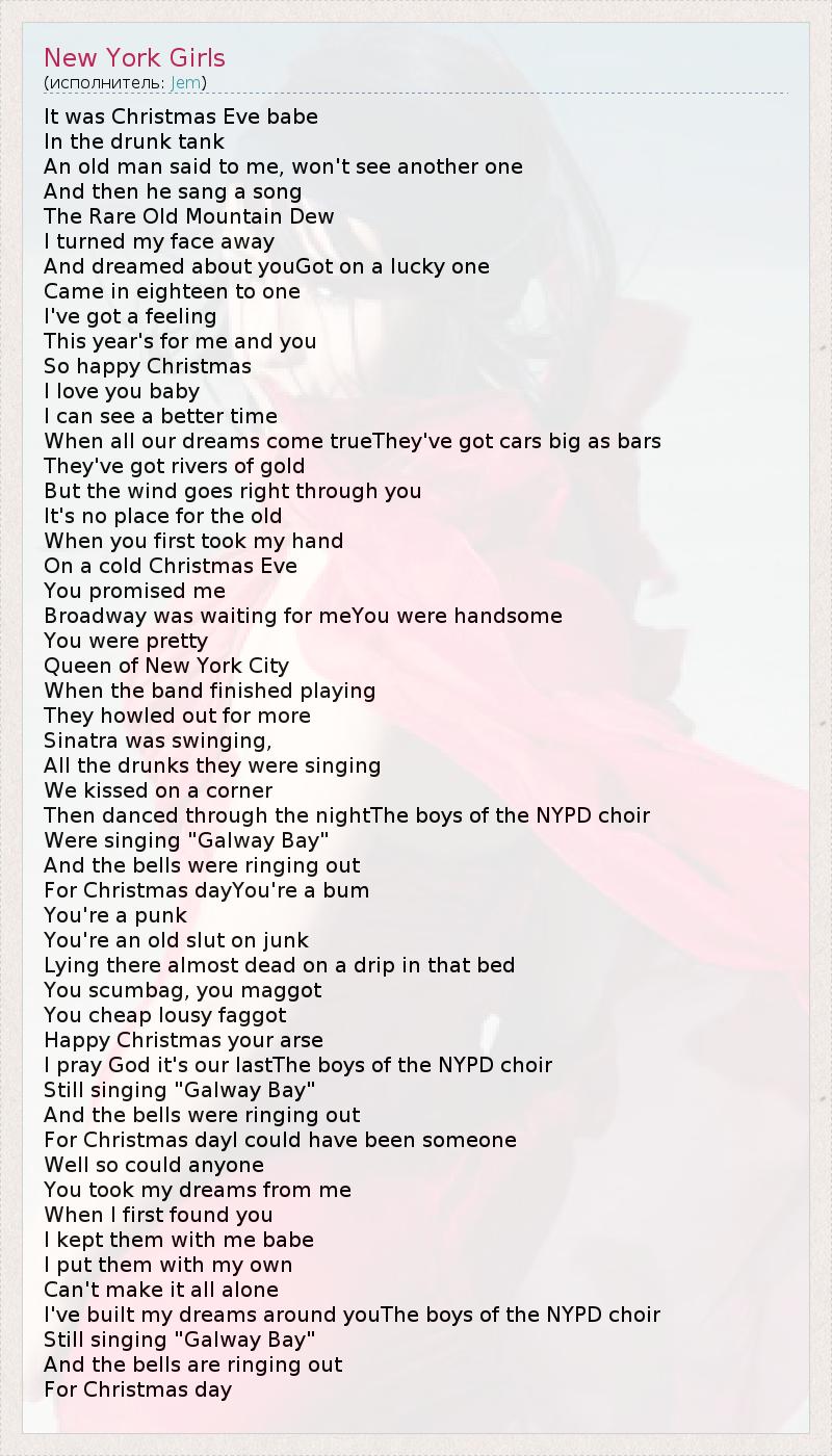 It was Christmas Eve babe In the drunk tank An old man said to me, won't see another one And then he sang a song The Rare Old Mountain Dew I turned my face away And dreamed about youGot on a lucky one Came in eighteen to one I've got a feeling This year's for me and you So happy Christmas I love you baby I can see a better time When all our dreams come trueThey've got cars big as bars They've got rivers of gold But the wind goes right through you It's no place for the old When you first took my hand On a cold Christmas Eve You promised me Broadway was waiting for meYou were handsome You were pretty Queen of New York City When the band finished playing They howled out for more Sinatra was swinging, All the drunks they were singing We kissed on a corner Then danced through the nightThe boys of the NYPD choir Were singing "Galway Bay" And the bells were ringing out For Christmas dayYou're a bum You're a punk You're an old slut on junk Lying there almost dead on a drip in that bed You scumbag, you maggot You cheap lousy faggot Happy Christmas your arse I pray God it's our lastThe boys of the NYPD choir Still singing "Galway Bay" And the bells were ringing out For Christmas dayI could have been someone Well so could anyone You took my dreams from me When I first found you I kept them with me babe I put them with my own Can't make it all alone I've built my dreams around youThe boys of the NYPD choir Still singing "Galway Bay" And the bells are ringing out For Christmas day