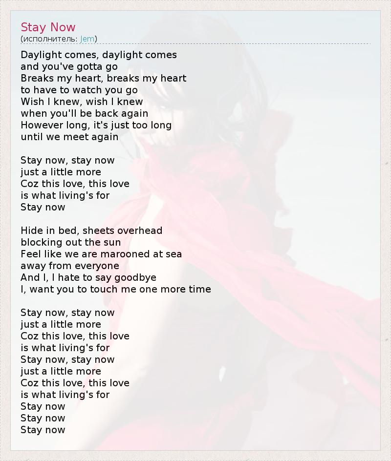 Daylight comes, daylight comes and you've gotta go Breaks my heart, breaks my heart to have to watch you go Wish I knew, wish I knew when you'll be back again However long, it's just too long until we meet again Stay now, stay now just a little more Coz this love, this love is what living's for Stay now Hide in bed, sheets overhead blocking out the sun Feel like we are marooned at sea away from everyone And I, I hate to say goodbye I, want you to touch me one more time Stay now, stay now just a little more Coz this love, this love is what living's for Stay now, stay now just a little more Coz this love, this love is what living's for Stay now Stay now Stay now