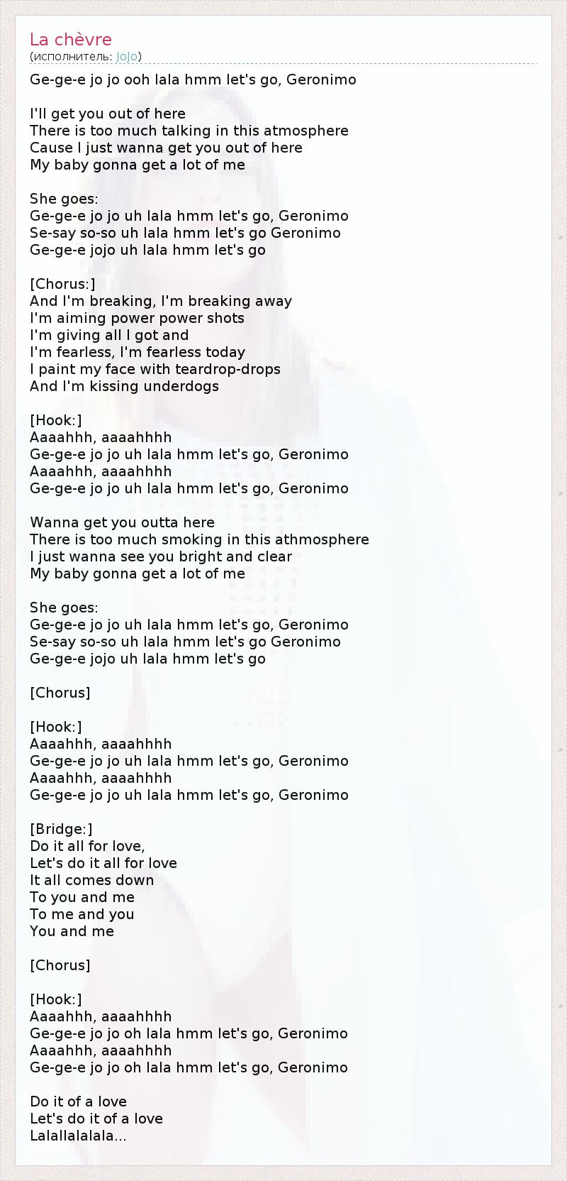 Ge-ge-e jo jo ooh lala hmm let's go, Geronimo I'll get you out of here There is too much talking in this atmosphere Cause I just wanna get you out of here My baby gonna get a lot of me She goes: Ge-ge-e jo jo uh lala hmm let's go, Geronimo Se-say so-so uh lala hmm let's go Geronimo Ge-ge-e jojo uh lala hmm let's go [Chorus:] And I'm breaking, I'm breaking away I'm aiming power power shots I'm giving all I got and I'm fearless, I'm fearless today I paint my face with teardrop-drops And I'm kissing underdogs [Hook:] Aaaahhh, aaaahhhh Ge-ge-e jo jo uh lala hmm let's go, Geronimo Aaaahhh, aaaahhhh Ge-ge-e jo jo uh lala hmm let's go, Geronimo Wanna get you outta here There is too much smoking in this athmosphere I just wanna see you bright and clear My baby gonna get a lot of me She goes: Ge-ge-e jo jo uh lala hmm let's go, Geronimo Se-say so-so uh lala hmm let's go Geronimo Ge-ge-e jojo uh lala hmm let's go [Chorus] [Hook:] Aaaahhh, aaaahhhh Ge-ge-e jo jo uh lala hmm let's go, Geronimo Aaaahhh, aaaahhhh Ge-ge-e jo jo uh lala hmm let's go, Geronimo [Bridge:] Do it all for love, Let's do it all for love It all comes down To you and me To me and you You and me [Chorus] [Hook:] Aaaahhh, aaaahhhh Ge-ge-e jo jo oh lala hmm let's go, Geronimo Aaaahhh, aaaahhhh Ge-ge-e jo jo oh lala hmm let's go, Geronimo Do it of a love Let's do it of a love Lalallalalala...
