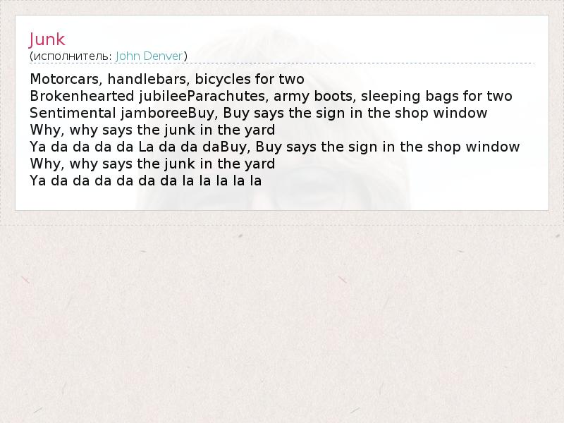 Это интересно:Джон Денвер (John Denver, наст. имя Henry John Deutschendorf Jr., 31 декабря 1943 — 12 октября 1997) — американский бард, самый коммерчески успешный сольный исполнитель в истории фолк-музыки. За свою карьеру он записал более 300 песен, большинство из которых сам же и написал (пример — Take Me Home Country Roads).В конце 1960-х годов Денвер выступал в составе трио Чэда Митчелла, однако с 1969 года посвятил себя сольной карьере.... продолжение