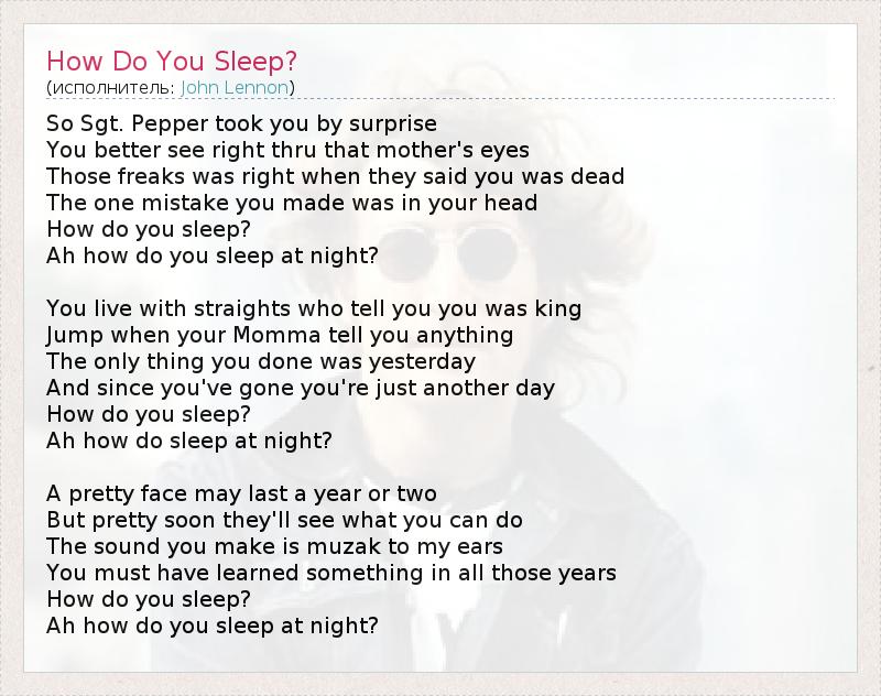 How Do You Sleep? — фактически, письмо Леннона Полу Маккартни. Песня содержит как намёки, так и прямые оскорбления (хотя слова о том, что Маккартни где-то украл мелодию «Yesterday», были в итоге вырезаны из текста). Начало песни напоминает начало композиции Маккартни «Sgt. Pepper’s Lonely Hearts Club Band» из одноимённого альбома «The Beatles».