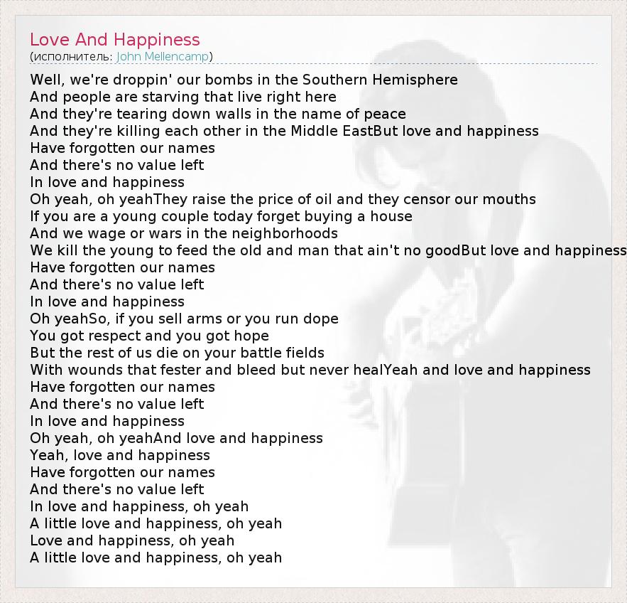 Well, we're droppin' our bombs in the Southern Hemisphere And people are starving that live right here And they're tearing down walls in the name of peace And they're killing each other in the Middle EastBut love and happiness Have forgotten our names And there's no value left In love and happiness Oh yeah, oh yeahThey raise the price of oil and they censor our mouths If you are a young couple today forget buying a house And we wage or wars in the neighborhoods We kill the young to feed the old and man that ain't no goodBut love and happiness Have forgotten our names And there's no value left In love and happiness Oh yeahSo, if you sell arms or you run dope You got respect and you got hope But the rest of us die on your battle fields With wounds that fester and bleed but never healYeah and love and happiness Have forgotten our names And there's no value left In love and happiness Oh yeah, oh yeahAnd love and happiness Yeah, love and happiness Have forgotten our names And there's no value left In love and happiness, oh yeah A little love and happiness, oh yeah Love and happiness, oh yeah A little love and happiness, oh yeah