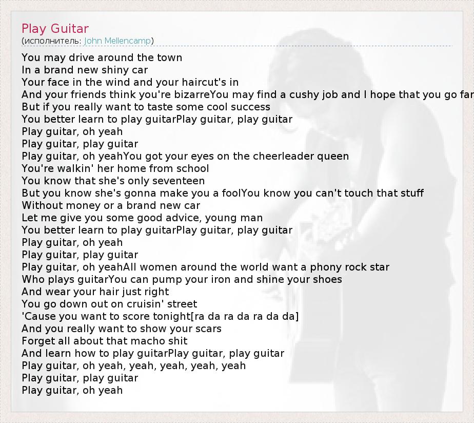 You may drive around the town In a brand new shiny car Your face in the wind and your haircut's in And your friends think you're bizarreYou may find a cushy job and I hope that you go far But if you really want to taste some cool success You better learn to play guitarPlay guitar, play guitar Play guitar, oh yeah Play guitar, play guitar Play guitar, oh yeahYou got your eyes on the cheerleader queen You're walkin' her home from school You know that she's only seventeen But you know she's gonna make you a foolYou know you can't touch that stuff Without money or a brand new car Let me give you some good advice, young man You better learn to play guitarPlay guitar, play guitar Play guitar, oh yeah Play guitar, play guitar Play guitar, oh yeahAll women around the world want a phony rock star Who plays guitarYou can pump your iron and shine your shoes And wear your hair just right You go down out on cruisin' street 'Cause you want to score tonight[ra da ra da ra da da] And you really want to show your scars Forget all about that macho shit And learn how to play guitarPlay guitar, play guitar Play guitar, oh yeah, yeah, yeah, yeah, yeah Play guitar, play guitar Play guitar, oh yeah