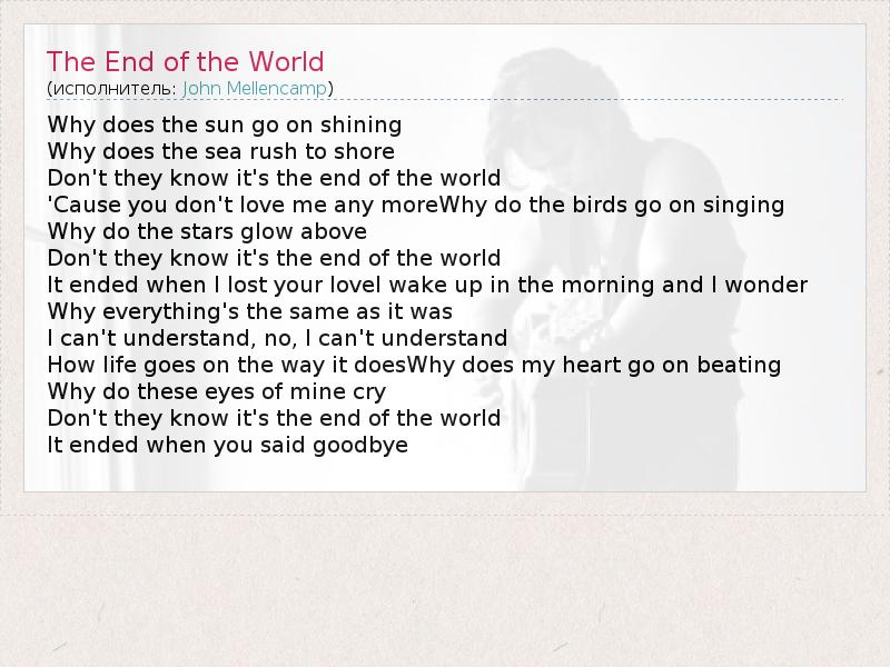 Why does the sun go on shining Why does the sea rush to shore Don't they know it's the end of the world 'Cause you don't love me any moreWhy do the birds go on singing Why do the stars glow above Don't they know it's the end of the world It ended when I lost your loveI wake up in the morning and I wonder Why everything's the same as it was I can't understand, no, I can't understand How life goes on the way it doesWhy does my heart go on beating Why do these eyes of mine cry Don't they know it's the end of the world It ended when you said goodbye