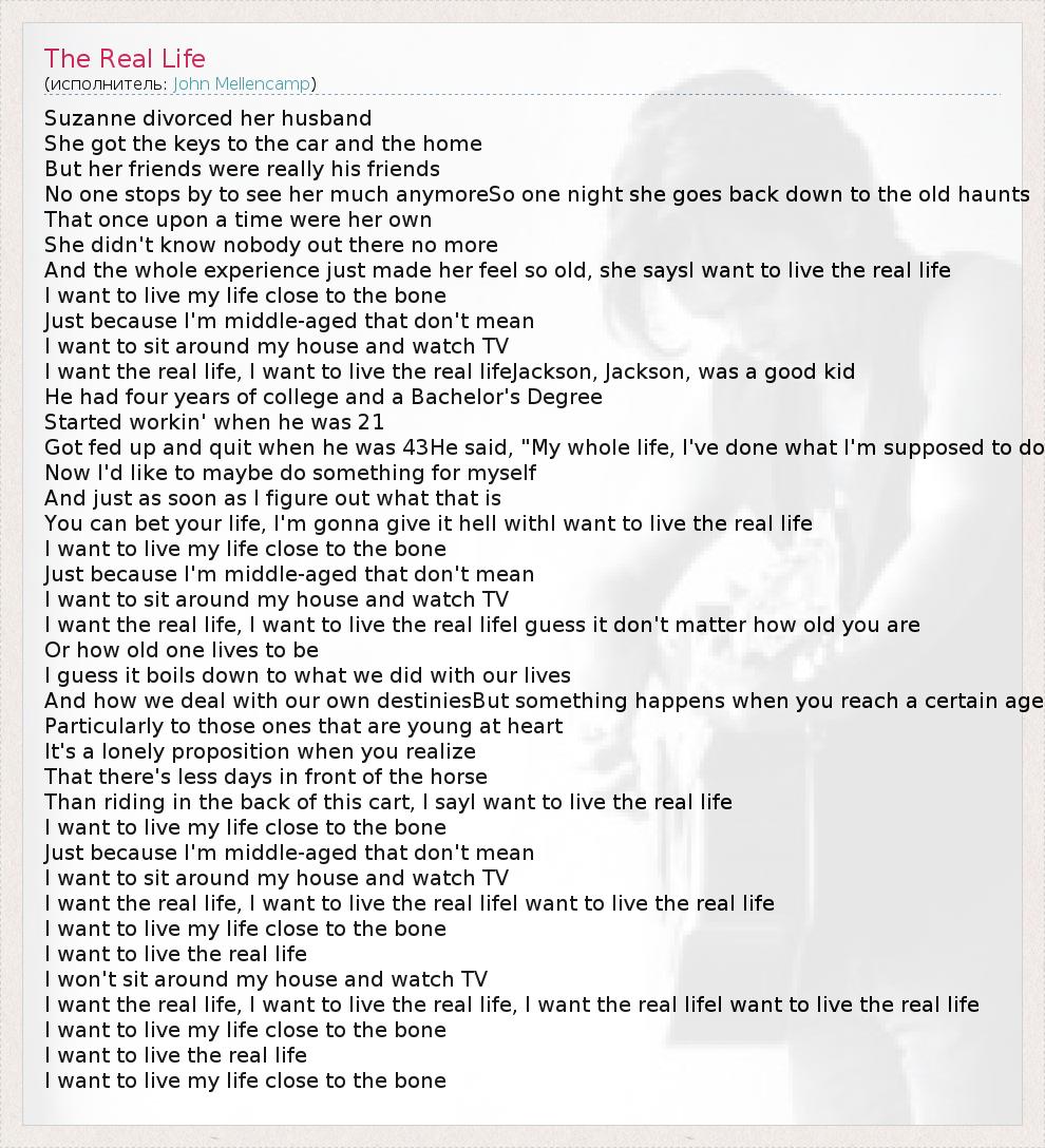 Suzanne divorced her husband She got the keys to the car and the home But her friends were really his friends No one stops by to see her much anymoreSo one night she goes back down to the old haunts That once upon a time were her own She didn't know nobody out there no more And the whole experience just made her feel so old, she saysI want to live the real life I want to live my life close to the bone Just because I'm middle-aged that don't mean I want to sit around my house and watch TV I want the real life, I want to live the real lifeJackson, Jackson, was a good kid He had four years of college and a Bachelor's Degree Started workin' when he was 21 Got fed up and quit when he was 43He said, "My whole life, I've done what I'm supposed to do Now I'd like to maybe do something for myself And just as soon as I figure out what that is You can bet your life, I'm gonna give it hell withI want to live the real life I want to live my life close to the bone Just because I'm middle-aged that don't mean I want to sit around my house and watch TV I want the real life, I want to live the real lifeI guess it don't matter how old you are Or how old one lives to be I guess it boils down to what we did with our lives And how we deal with our own destiniesBut something happens when you reach a certain age Particularly to those ones that are young at heart It's a lonely proposition when you realize That there's less days in front of the horse Than riding in the back of this cart, I sayI want to live the real life I want to live my life close to the bone Just because I'm middle-aged that don't mean I want to sit around my house and watch TV I want the real life, I want to live the real lifeI want to live the real life I want to live my life close to the bone I want to live the real life I won't sit around my house and watch TV I want the real life, I want to live the real life, I want the real lifeI want to live the real life I want to live my life close to the bone I want to live the real life I want to live my life close to the bone
