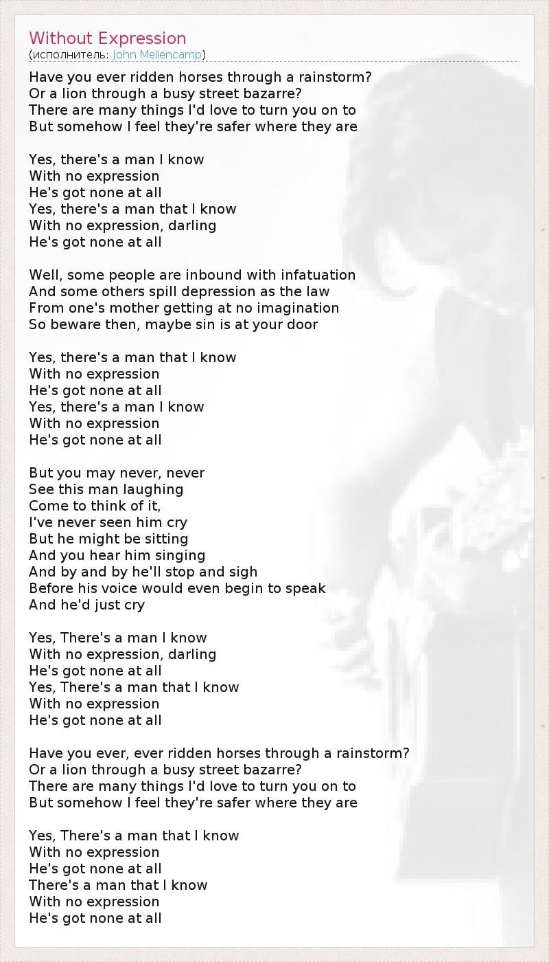 Have you ever ridden horses through a rainstorm? Or a lion through a busy street bazarre? There are many things I'd love to turn you on to But somehow I feel they're safer where they are Yes, there's a man I know With no expression He's got none at all Yes, there's a man that I know With no expression, darling He's got none at all Well, some people are inbound with infatuation And some others spill depression as the law From one's mother getting at no imagination So beware then, maybe sin is at your door Yes, there's a man that I know With no expression He's got none at all Yes, there's a man I know With no expression He's got none at all But you may never, never See this man laughing Come to think of it, I've never seen him cry But he might be sitting And you hear him singing And by and by he'll stop and sigh Before his voice would even begin to speak And he'd just cry Yes, There's a man I know With no expression, darling He's got none at all Yes, There's a man that I know With no expression He's got none at all Have you ever, ever ridden horses through a rainstorm? Or a lion through a busy street bazarre? There are many things I'd love to turn you on to But somehow I feel they're safer where they are Yes, There's a man that I know With no expression He's got none at all There's a man that I know With no expression He's got none at all