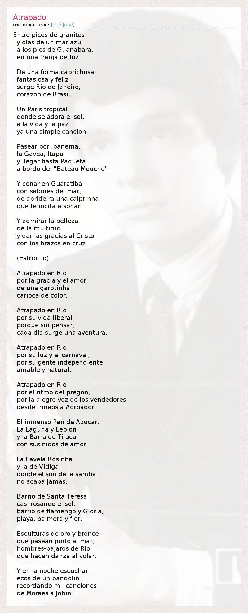 Entre picos de granitos y olas de un mar azul a los pies de Guanabara, en una franja de luz. De una forma caprichosa, fantasiosa y feliz surge Rio de Janeiro, corazon de Brasil. Un Paris tropical donde se adora el sol, a la vida y la paz ya una simple cancion. Pasear por Ipanema, la Gavea, Itapu y llegar hasta Paqueta a bordo del "Bateau Mouche" Y cenar en Guaratiba con sabores del mar, de abrideira una caiprinha que te incita a sonar. Y admirar la belleza de la multitud y dar las gracias al Cristo con los brazos en cruz. (Estribillo) Atrapado en Rio por la gracia y el amor de una garotinha carioca de color. Atrapado en Rio por su vida liberal, porque sin pensar, cada dia surge una aventura. Atrapado en Rio por su luz y el carnaval, por su gente independiente, amable y natural. Atrapado en Rio por el ritmo del pregon, por la alegre voz de los vendedores desde Irmaos a Aorpador. El inmenso Pan de Azucar, La Laguna y Leblon y la Barra de Tijuca con sus nidos de amor. La Favela Rosinha y la de Vidigal donde el son de la samba no acaba jamas. Barrio de Santa Teresa casi rosando el sol, barrio de flamengo y Gloria, playa, palmera y flor. Esculturas de oro y bronce que pasean junto al mar, hombres-pajaros de Rio que hacen danza al volar. Y en la noche escuchar ecos de un bandolin recordando mil canciones de Moraes a Jobin.