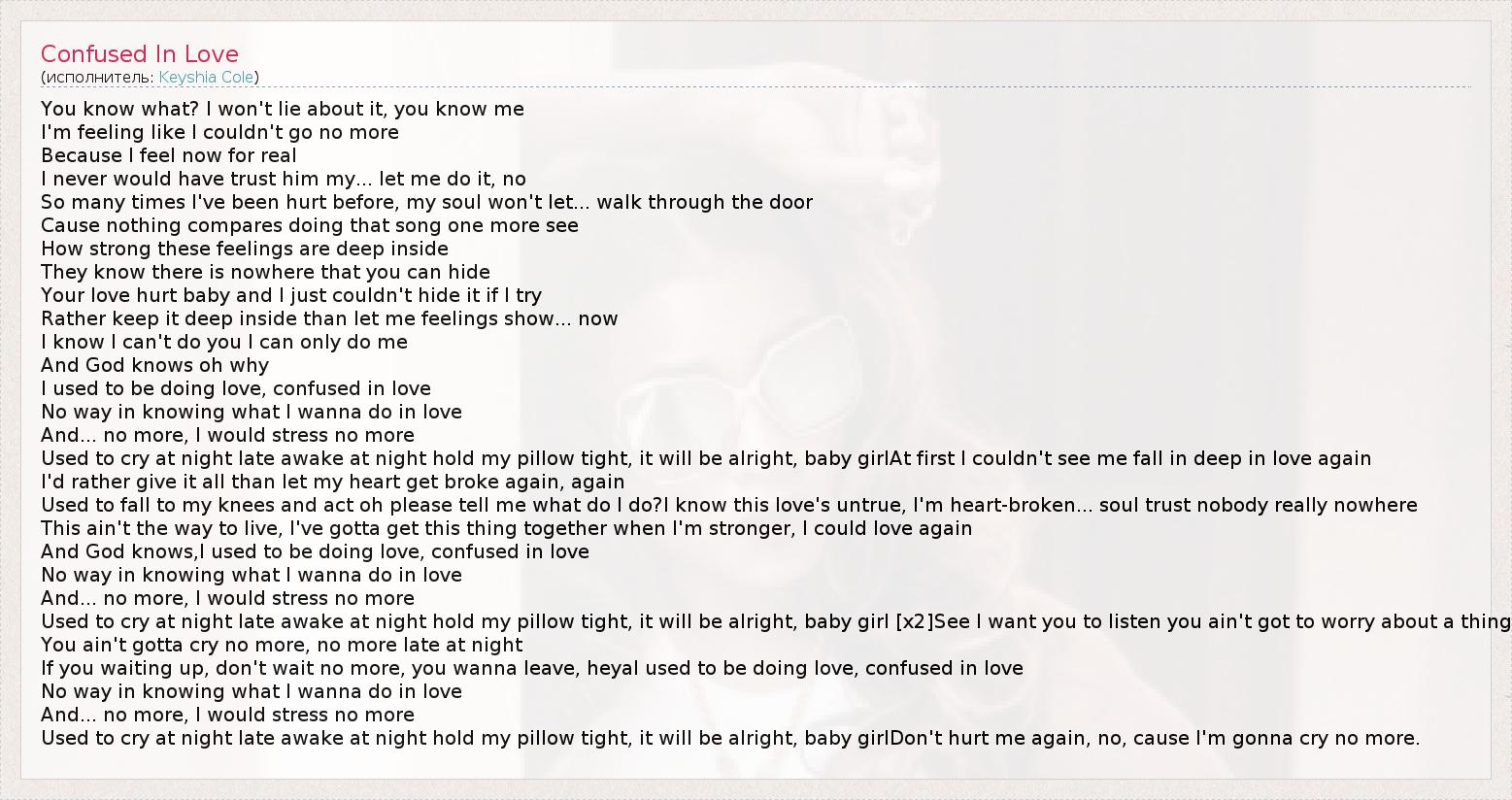You know what? I won't lie about it, you know me I'm feeling like I couldn't go no more Because I feel now for real I never would have trust him my... let me do it, no So many times I've been hurt before, my soul won't let... walk through the door Cause nothing compares doing that song one more see How strong these feelings are deep inside They know there is nowhere that you can hide Your love hurt baby and I just couldn't hide it if I try Rather keep it deep inside than let me feelings show... now I know I can't do you I can only do me And God knows oh why I used to be doing love, confused in love No way in knowing what I wanna do in love And... no more, I would stress no more Used to cry at night late awake at night hold my pillow tight, it will be alright, baby girlAt first I couldn't see me fall in deep in love again I'd rather give it all than let my heart get broke again, again Used to fall to my knees and act oh please tell me what do I do?I know this love's untrue, I'm heart-broken... soul trust nobody really nowhere This ain't the way to live, I've gotta get this thing together when I'm stronger, I could love again And God knows,I used to be doing love, confused in love No way in knowing what I wanna do in love And... no more, I would stress no more Used to cry at night late awake at night hold my pillow tight, it will be alright, baby girl [x2]See I want you to listen you ain't got to worry about a thing You ain't gotta cry no more, no more late at night If you waiting up, don't wait no more, you wanna leave, heyaI used to be doing love, confused in love No way in knowing what I wanna do in love And... no more, I would stress no more Used to cry at night late awake at night hold my pillow tight, it will be alright, baby girlDon't hurt me again, no, cause I'm gonna cry no more.