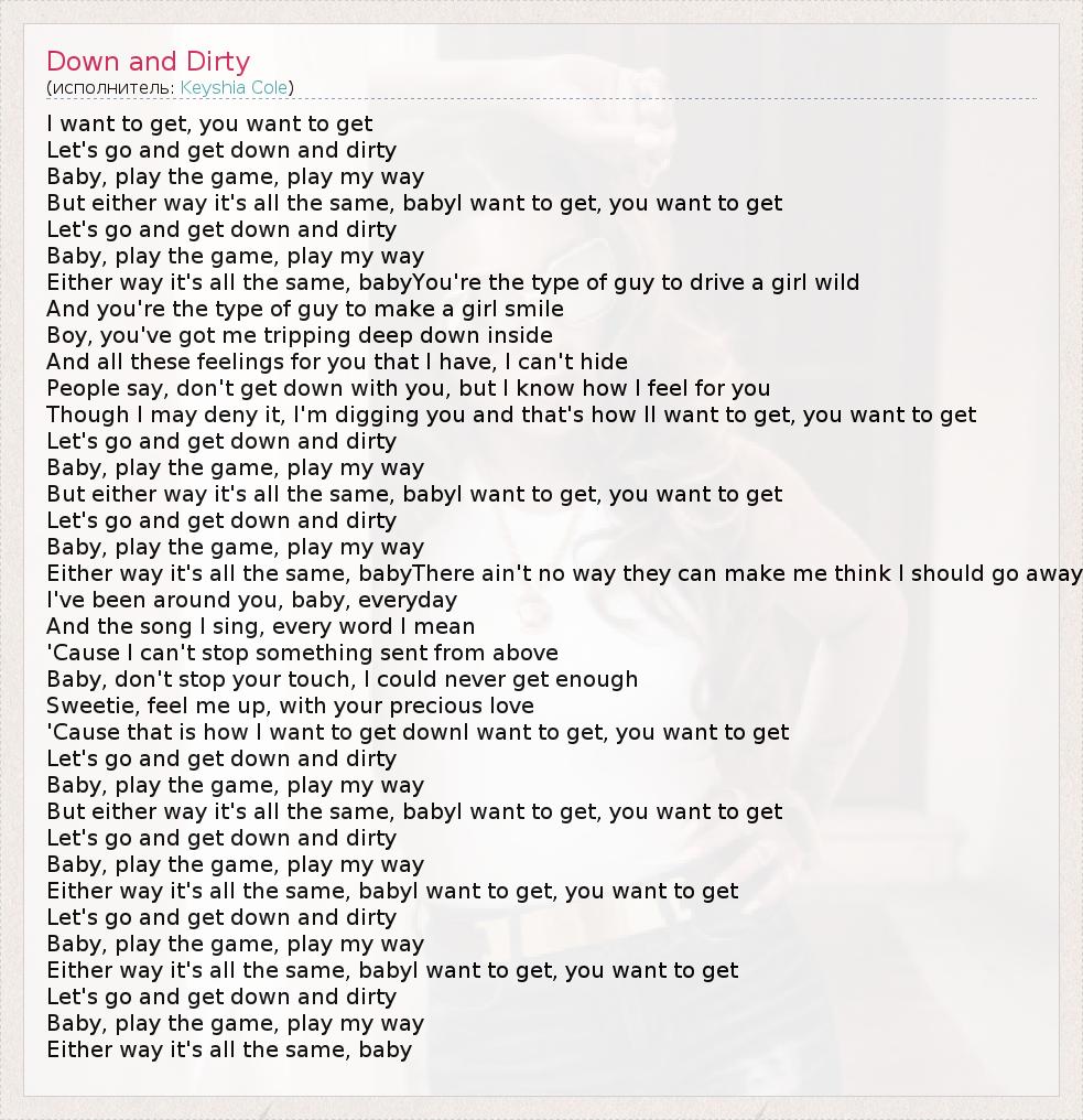 I want to get, you want to get Let's go and get down and dirty Baby, play the game, play my way But either way it's all the same, babyI want to get, you want to get Let's go and get down and dirty Baby, play the game, play my way Either way it's all the same, babyYou're the type of guy to drive a girl wild And you're the type of guy to make a girl smile Boy, you've got me tripping deep down inside And all these feelings for you that I have, I can't hide People say, don't get down with you, but I know how I feel for you Though I may deny it, I'm digging you and that's how II want to get, you want to get Let's go and get down and dirty Baby, play the game, play my way But either way it's all the same, babyI want to get, you want to get Let's go and get down and dirty Baby, play the game, play my way Either way it's all the same, babyThere ain't no way they can make me think I should go away I've been around you, baby, everyday And the song I sing, every word I mean 'Cause I can't stop something sent from above Baby, don't stop your touch, I could never get enough Sweetie, feel me up, with your precious love 'Cause that is how I want to get downI want to get, you want to get Let's go and get down and dirty Baby, play the game, play my way But either way it's all the same, babyI want to get, you want to get Let's go and get down and dirty Baby, play the game, play my way Either way it's all the same, babyI want to get, you want to get Let's go and get down and dirty Baby, play the game, play my way Either way it's all the same, babyI want to get, you want to get Let's go and get down and dirty Baby, play the game, play my way Either way it's all the same, baby