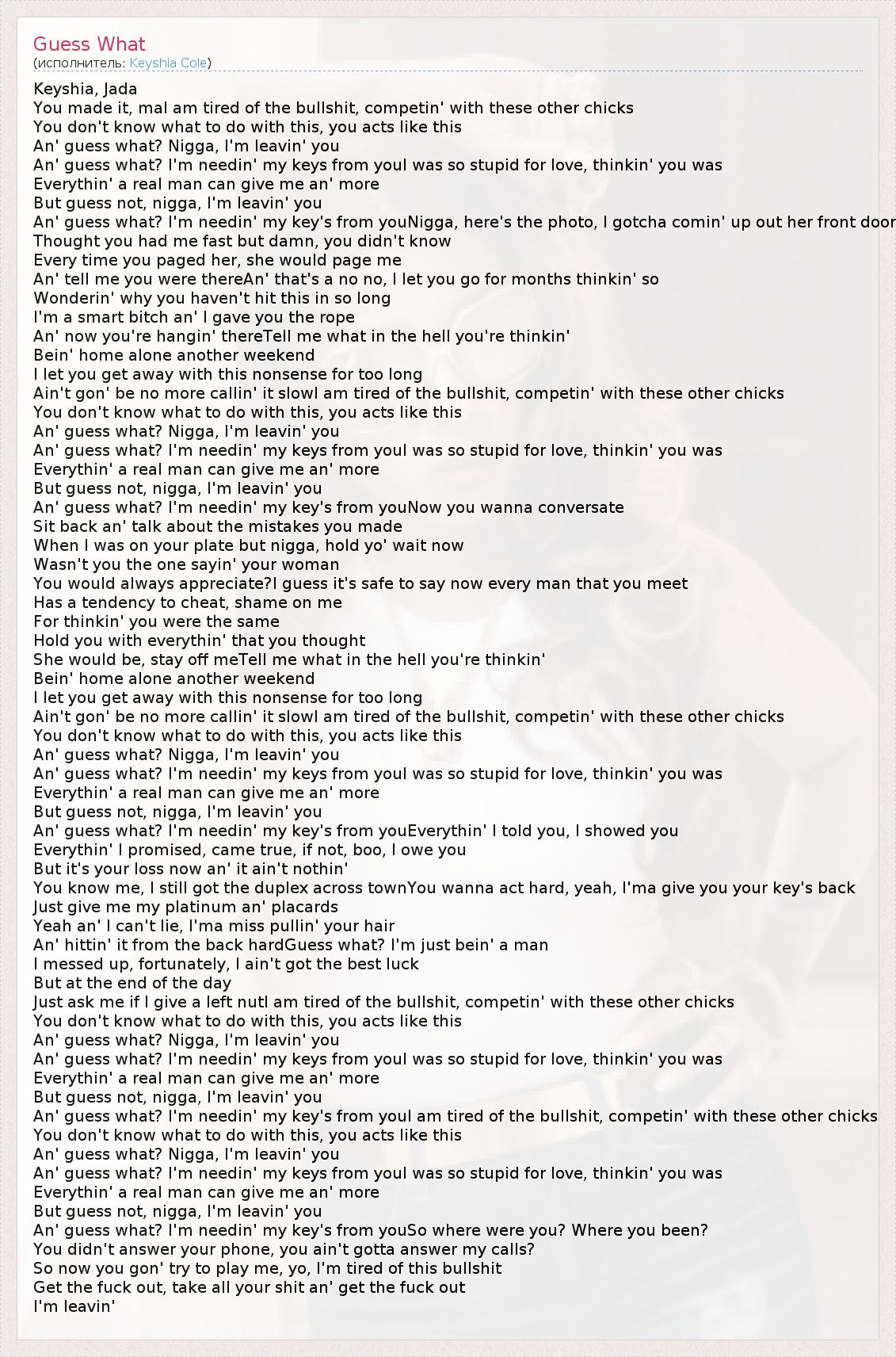 An' guess what? I'm needin' my key's from youI am tired of the bullshit, competin' with these other chicks