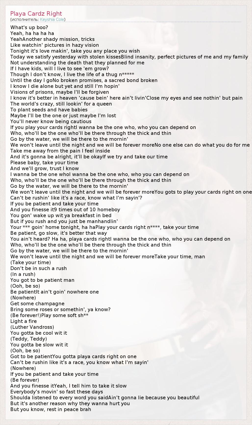 А как ты думаешь, о чем песня "Playa Cardz Right" ?