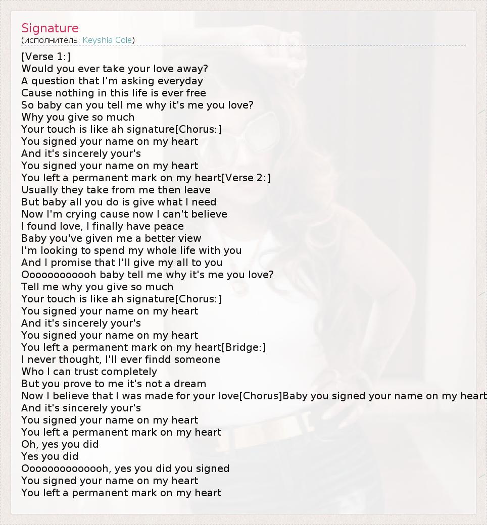 [Verse 1:] Would you ever take your love away? A question that I'm asking everyday Cause nothing in this life is ever free So baby can you tell me why it's me you love? Why you give so much Your touch is like ah signature[Chorus:] You signed your name on my heart And it's sincerely your's You signed your name on my heart You left a permanent mark on my heart[Verse 2:] Usually they take from me then leave But baby all you do is give what I need Now I'm crying cause now I can't believe I found love, I finally have peace Baby you've given me a better view I'm looking to spend my whole life with you And I promise that I'll give my all to you Oooooooooooh baby tell me why it's me you love? Tell me why you give so much Your touch is like ah signature[Chorus:] You signed your name on my heart And it's sincerely your's You signed your name on my heart You left a permanent mark on my heart[Bridge:] I never thought, I'll ever findd someone Who I can trust completely But you prove to me it's not a dream Now I believe that I was made for your love[Chorus]Baby you signed your name on my heart And it's sincerely your's You signed your name on my heart You left a permanent mark on my heart Oh, yes you did Yes you did Oooooooooooooh, yes you did you signed You signed your name on my heart You left a permanent mark on my heart