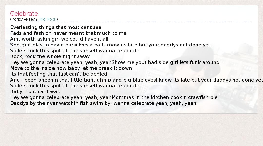 Это интересно:Роберт Джеймс Ричи, выступающий под сценическим псевдонимом Kid Rock, родился 17 января 1971 года в городе Ромео, штат Мичиган. Свое первое демо он записал в 1988 году, будучи под влиянием работы группы Beastie Boys "Licensed To Ill". В конце 80-х Kid Rock подписал контракт с фирмой Jive Records, которая в 1990 году выпустила его дебютный альбом "Sandwiches for Breakfast". Песня "Yodelin' in the Valley" с этого... продолжение