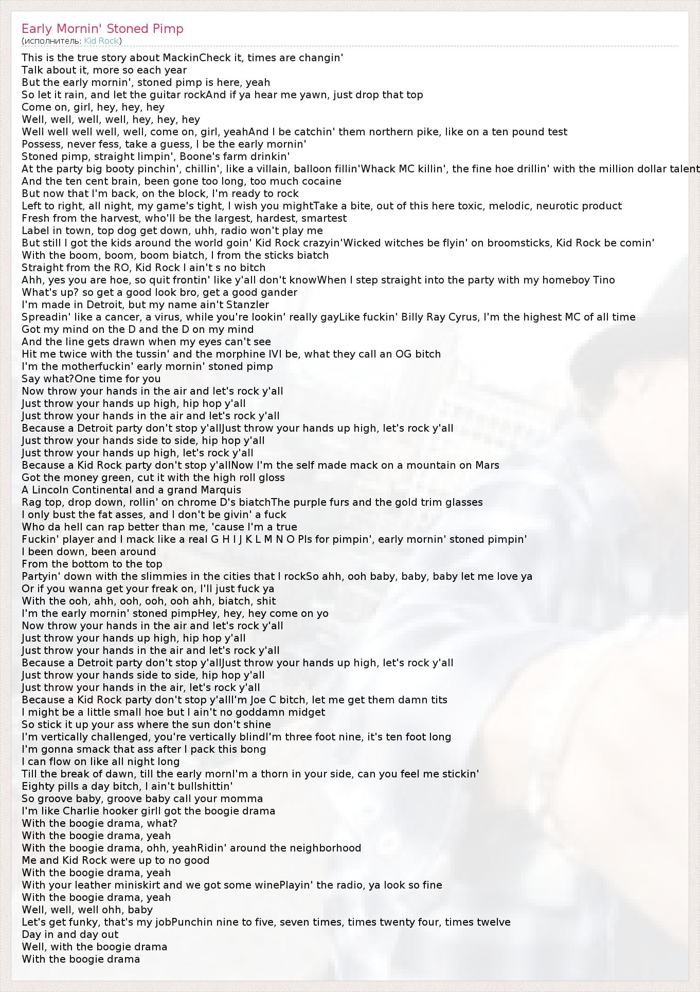 This is the true story about MackinCheck it, times are changin' Talk about it, more so each year But the early mornin', stoned pimp is here, yeah So let it rain, and let the guitar rockAnd if ya hear me yawn, just drop that top Come on, girl, hey, hey, hey Well, well, well, well, hey, hey, hey Well well well well, well, come on, girl, yeahAnd I be catchin' them northern pike, like on a ten pound test Possess, never fess, take a guess, I be the early mornin' Stoned pimp, straight limpin', Boone's farm drinkin' At the party big booty pinchin', chillin', like a villain, balloon fillin'Whack MC killin', the fine hoe drillin' with the million dollar talent And the ten cent brain, been gone too long, too much cocaine But now that I'm back, on the block, I'm ready to rock Left to right, all night, my game's tight, I wish you mightTake a bite, out of this here toxic, melodic, neurotic product Fresh from the harvest, who'll be the largest, hardest, smartest Label in town, top dog get down, uhh, radio won't play me But still I got the kids around the world goin' Kid Rock crazyin'Wicked witches be flyin' on broomsticks, Kid Rock be comin' With the boom, boom, boom biatch, I from the sticks biatch Straight from the RO, Kid Rock I ain't s no bitch Ahh, yes you are hoe, so quit frontin' like y'all don't knowWhen I step straight into the party with my homeboy Tino What's up? so get a good look bro, get a good gander I'm made in Detroit, but my name ain't Stanzler Spreadin' like a cancer, a virus, while you're lookin' really gayLike fuckin' Billy Ray Cyrus, I'm the highest MC of all time Got my mind on the D and the D on my mind And the line gets drawn when my eyes can't see Hit me twice with the tussin' and the morphine IVI be, what they call an OG bitch I'm the motherfuckin' early mornin' stoned pimp Say what?One time for you Now throw your hands in the air and let's rock y'all Just throw your hands up high, hip hop y'all Just throw your hands in the air and let's rock y'all Because a Detroit party don't stop y'allJust throw your hands up high, let's rock y'all Just throw your hands side to side, hip hop y'all Just throw your hands up high, let's rock y'all Because a Kid Rock party don't stop y'allNow I'm the self made mack on a mountain on Mars Got the money green, cut it with the high roll gloss A Lincoln Continental and a grand Marquis Rag top, drop down, rollin' on chrome D's biatchThe purple furs and the gold trim glasses I only bust the fat asses, and I don't be givin' a fuck Who da hell can rap better than me, 'cause I'm a true Fuckin' player and I mack like a real G H I J K L M N O PIs for pimpin', early mornin' stoned pimpin' I been down, been around From the bottom to the top Partyin' down with the slimmies in the cities that I rockSo ahh, ooh baby, baby, baby let me love ya Or if you wanna get your freak on, I'll just fuck ya With the ooh, ahh, ooh, ooh, ooh ahh, biatch, shit I'm the early mornin' stoned pimpHey, hey, hey come on yo Now throw your hands in the air and let's rock y'all Just throw your hands up high, hip hop y'all Just throw your hands in the air and let's rock y'all Because a Detroit party don't stop y'allJust throw your hands up high, let's rock y'all Just throw your hands side to side, hip hop y'all Just throw your hands in the air, let's rock y'all Because a Kid Rock party don't stop y'allI'm Joe C bitch, let me get them damn tits I might be a little small hoe but I ain't no goddamn midget So stick it up your ass where the sun don't shine I'm vertically challenged, you're vertically blindI'm three foot nine, it's ten foot long I'm gonna smack that ass after I pack this bong I can flow on like all night long Till the break of dawn, till the early mornI'm a thorn in your side, can you feel me stickin' Eighty pills a day bitch, I ain't bullshittin' So groove baby, groove baby call your momma I'm like Charlie hooker girlI got the boogie drama With the boogie drama, what? With the boogie drama, yeah With the boogie drama, ohh, yeahRidin' around the neighborhood Me and Kid Rock were up to no good With the boogie drama, yeah With your leather miniskirt and we got some winePlayin' the radio, ya look so fine With the boogie drama, yeah Well, well, well ohh, baby Let's get funky, that's my jobPunchin nine to five, seven times, times twenty four, times twelve Day in and day out Well, with the boogie drama With the boogie drama