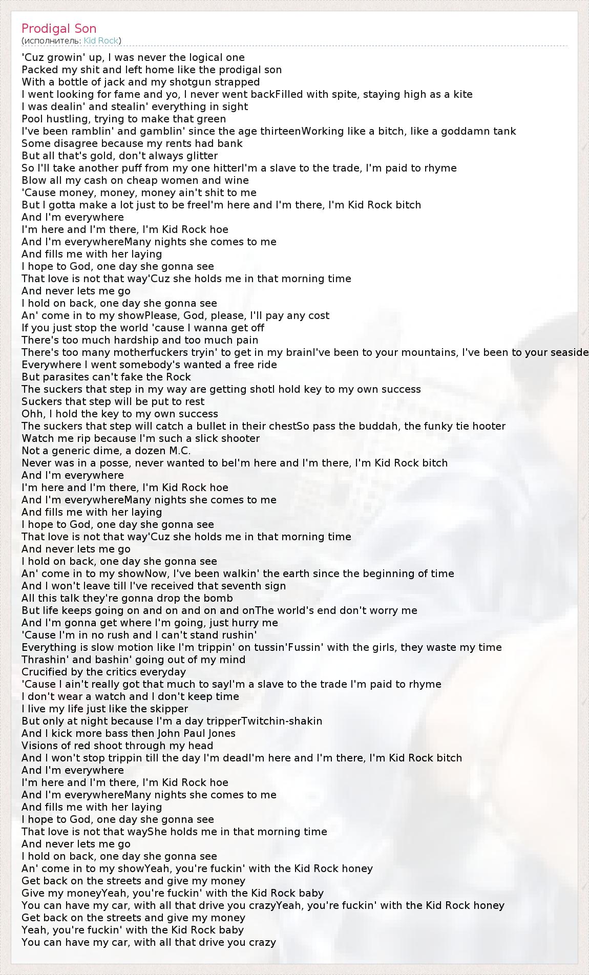 'Cuz growin' up, I was never the logical one Packed my shit and left home like the prodigal son With a bottle of jack and my shotgun strapped I went looking for fame and yo, I never went backFilled with spite, staying high as a kite I was dealin' and stealin' everything in sight Pool hustling, trying to make that green I've been ramblin' and gamblin' since the age thirteenWorking like a bitch, like a goddamn tank Some disagree because my rents had bank But all that's gold, don't always glitter So I'll take another puff from my one hitterI'm a slave to the trade, I'm paid to rhyme Blow all my cash on cheap women and wine 'Cause money, money, money ain't shit to me But I gotta make a lot just to be freeI'm here and I'm there, I'm Kid Rock bitch And I'm everywhere I'm here and I'm there, I'm Kid Rock hoe And I'm everywhereMany nights she comes to me And fills me with her laying I hope to God, one day she gonna see That love is not that way'Cuz she holds me in that morning time And never lets me go I hold on back, one day she gonna see An' come in to my showPlease, God, please, I'll pay any cost If you just stop the world 'cause I wanna get off There's too much hardship and too much pain There's too many motherfuckers tryin' to get in my brainI've been to your mountains, I've been to your seaside Everywhere I went somebody's wanted a free ride But parasites can't fake the Rock The suckers that step in my way are getting shotI hold key to my own success Suckers that step will be put to rest Ohh, I hold the key to my own success The suckers that step will catch a bullet in their chestSo pass the buddah, the funky tie hooter Watch me rip because I'm such a slick shooter Not a generic dime, a dozen M.C. Never was in a posse, never wanted to beI'm here and I'm there, I'm Kid Rock bitch And I'm everywhere I'm here and I'm there, I'm Kid Rock hoe And I'm everywhereMany nights she comes to me And fills me with her laying I hope to God, one day she gonna see That love is not that way'Cuz she holds me in that morning time And never lets me go I hold on back, one day she gonna see An' come in to my showNow, I've been walkin' the earth since the beginning of time And I won't leave till I've received that seventh sign All this talk they're gonna drop the bomb But life keeps going on and on and on and onThe world's end don't worry me And I'm gonna get where I'm going, just hurry me 'Cause I'm in no rush and I can't stand rushin' Everything is slow motion like I'm trippin' on tussin'Fussin' with the girls, they waste my time Thrashin' and bashin' going out of my mind Crucified by the critics everyday 'Cause I ain't really got that much to sayI'm a slave to the trade I'm paid to rhyme I don't wear a watch and I don't keep time I live my life just like the skipper But only at night because I'm a day tripperTwitchin-shakin And I kick more bass then John Paul Jones Visions of red shoot through my head And I won't stop trippin till the day I'm deadI'm here and I'm there, I'm Kid Rock bitch And I'm everywhere I'm here and I'm there, I'm Kid Rock hoe And I'm everywhereMany nights she comes to me And fills me with her laying I hope to God, one day she gonna see That love is not that wayShe holds me in that morning time And never lets me go I hold on back, one day she gonna see An' come in to my showYeah, you're fuckin' with the Kid Rock honey Get back on the streets and give my money Give my moneyYeah, you're fuckin' with the Kid Rock baby You can have my car, with all that drive you crazyYeah, you're fuckin' with the Kid Rock honey Get back on the streets and give my money Yeah, you're fuckin' with the Kid Rock baby You can have my car, with all that drive you crazy