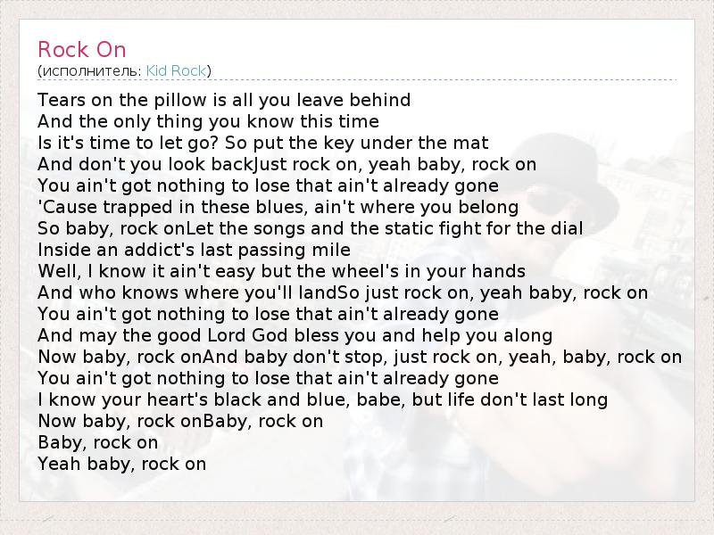 Tears on the pillow is all you leave behind And the only thing you know this time Is it's time to let go? So put the key under the mat And don't you look backJust rock on, yeah baby, rock on You ain't got nothing to lose that ain't already gone 'Cause trapped in these blues, ain't where you belong So baby, rock onLet the songs and the static fight for the dial Inside an addict's last passing mile Well, I know it ain't easy but the wheel's in your hands And who knows where you'll landSo just rock on, yeah baby, rock on You ain't got nothing to lose that ain't already gone And may the good Lord God bless you and help you along Now baby, rock onAnd baby don't stop, just rock on, yeah, baby, rock on You ain't got nothing to lose that ain't already gone I know your heart's black and blue, babe, but life don't last long Now baby, rock onBaby, rock on Baby, rock on Yeah baby, rock on