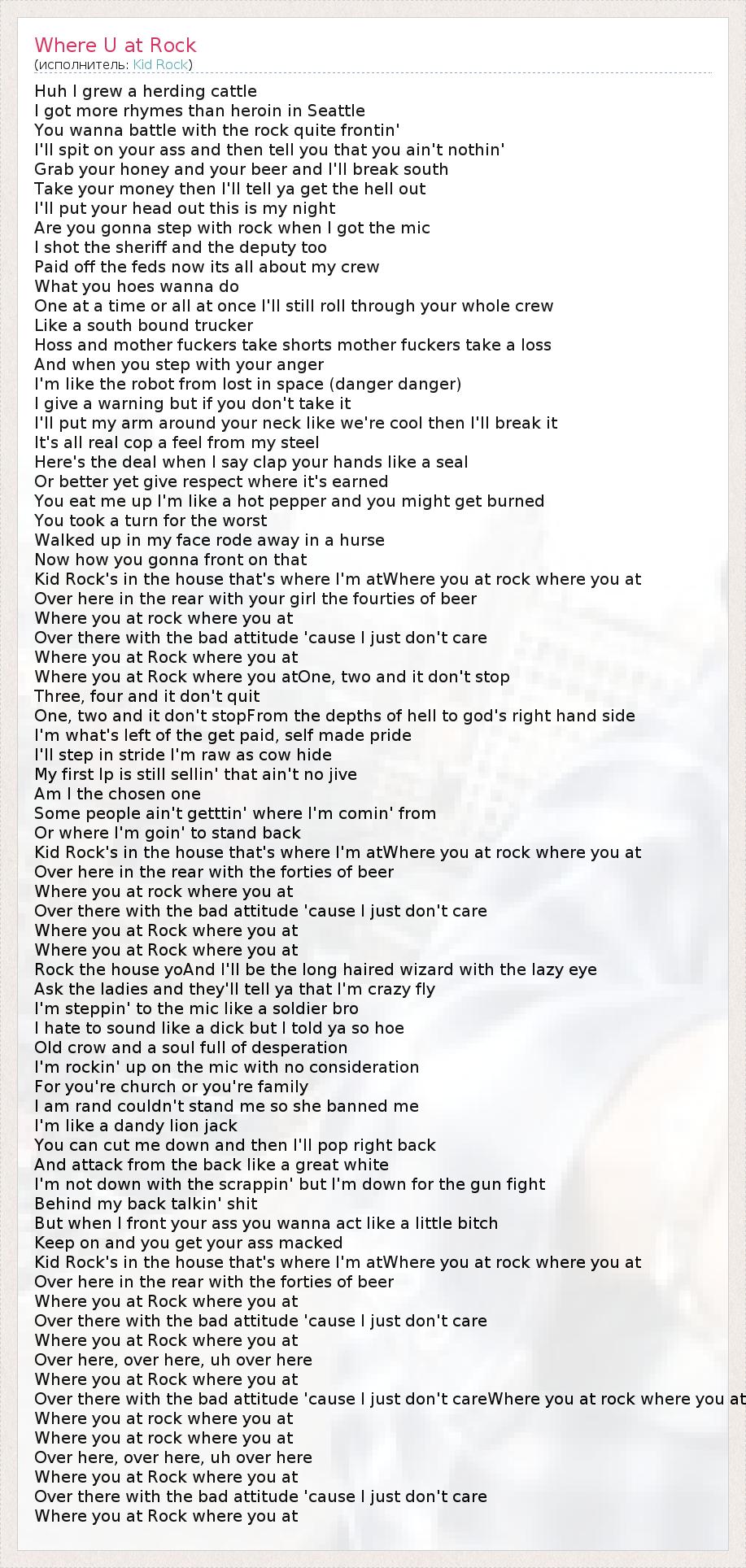 Huh I grew a herding cattle I got more rhymes than heroin in Seattle You wanna battle with the rock quite frontin' I'll spit on your ass and then tell you that you ain't nothin' Grab your honey and your beer and I'll break south Take your money then I'll tell ya get the hell out I'll put your head out this is my night Are you gonna step with rock when I got the mic I shot the sheriff and the deputy too Paid off the feds now its all about my crew What you hoes wanna do One at a time or all at once I'll still roll through your whole crew Like a south bound trucker Hoss and mother fuckers take shorts mother fuckers take a loss And when you step with your anger I'm like the robot from lost in space (danger danger) I give a warning but if you don't take it I'll put my arm around your neck like we're cool then I'll break it It's all real cop a feel from my steel Here's the deal when I say clap your hands like a seal Or better yet give respect where it's earned You eat me up I'm like a hot pepper and you might get burned You took a turn for the worst Walked up in my face rode away in a hurse Now how you gonna front on that Kid Rock's in the house that's where I'm atWhere you at rock where you at Over here in the rear with your girl the fourties of beer Where you at rock where you at Over there with the bad attitude 'cause I just don't care Where you at Rock where you at Where you at Rock where you atOne, two and it don't stop Three, four and it don't quit One, two and it don't stopFrom the depths of hell to god's right hand side I'm what's left of the get paid, self made pride I'll step in stride I'm raw as cow hide My first lp is still sellin' that ain't no jive Am I the chosen one Some people ain't getttin' where I'm comin' from Or where I'm goin' to stand back Kid Rock's in the house that's where I'm atWhere you at rock where you at Over here in the rear with the forties of beer Where you at rock where you at Over there with the bad attitude 'cause I just don't care Where you at Rock where you at Where you at Rock where you at Rock the house yoAnd I'll be the long haired wizard with the lazy eye Ask the ladies and they'll tell ya that I'm crazy fly I'm steppin' to the mic like a soldier bro I hate to sound like a dick but I told ya so hoe Old crow and a soul full of desperation I'm rockin' up on the mic with no consideration For you're church or you're family I am rand couldn't stand me so she banned me I'm like a dandy lion jack You can cut me down and then I'll pop right back And attack from the back like a great white I'm not down with the scrappin' but I'm down for the gun fight Behind my back talkin' shit But when I front your ass you wanna act like a little bitch Keep on and you get your ass macked Kid Rock's in the house that's where I'm atWhere you at rock where you at Over here in the rear with the forties of beer Where you at Rock where you at Over there with the bad attitude 'cause I just don't care Where you at Rock where you at Over here, over here, uh over here Where you at Rock where you at Over there with the bad attitude 'cause I just don't careWhere you at rock where you at Where you at rock where you at Where you at rock where you at Over here, over here, uh over here Where you at Rock where you at Over there with the bad attitude 'cause I just don't care Where you at Rock where you at