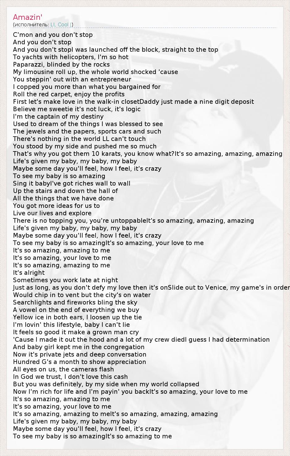 C'mon and you don't stop And you don't stop And you don't stopI was launched off the block, straight to the top To yachts with helicopters, I'm so hot Paparazzi, blinded by the rocks My limousine roll up, the whole world shocked 'cause You steppin' out with an entrepreneur I copped you more than what you bargained for Roll the red carpet, enjoy the profits First let's make love in the walk-in closetDaddy just made a nine digit deposit Believe me sweetie it's not luck, it's logic I'm the captain of my destiny Used to dream of the things I was blessed to see The jewels and the papers, sports cars and such There's nothing in the world LL can't touch You stood by my side and pushed me so much That's why you got them 10 karats, you know what?It's so amazing, amazing, amazing Life's given my baby, my baby, my baby Maybe some day you'll feel, how I feel, it's crazy To see my baby is so amazing Sing it babyI've got riches wall to wall Up the stairs and down the hall of All the things that we have done You got more ideas for us to Live our lives and explore There is no topping you, you're untoppableIt's so amazing, amazing, amazing Life's given my baby, my baby, my baby Maybe some day you'll feel, how I feel, it's crazy To see my baby is so amazingIt's so amazing, your love to me It's so amazing, amazing to me It's so amazing, your love to me It's so amazing, amazing to me It's alright Sometimes you work late at night Just as long, as you don't defy my love then it's onSlide out to Venice, my game's in order Would chip in to vent but the city's on water Searchlights and fireworks bling the sky A vowel on the end of everything we buy Yellow ice in both ears, I loosen up the tie I'm lovin' this lifestyle, baby I can't lie It feels so good it make a grown man cry 'Cause I made it out the hood and a lot of my crew diedI guess I had determination And baby girl kept me in the congregation Now it's private jets and deep conversation Hundred G's a month to show appreciation All eyes on us, the cameras flash In God we trust, I don't love this cash But you was definitely, by my side when my world collapsed Now I'm rich for life and I'm payin' you backIt's so amazing, your love to me It's so amazing, amazing to me It's so amazing, your love to me It's so amazing, amazing to meIt's so amazing, amazing, amazing Life's given my baby, my baby, my baby Maybe some day you'll feel, how I feel, it's crazy To see my baby is so amazingIt's so amazing to me