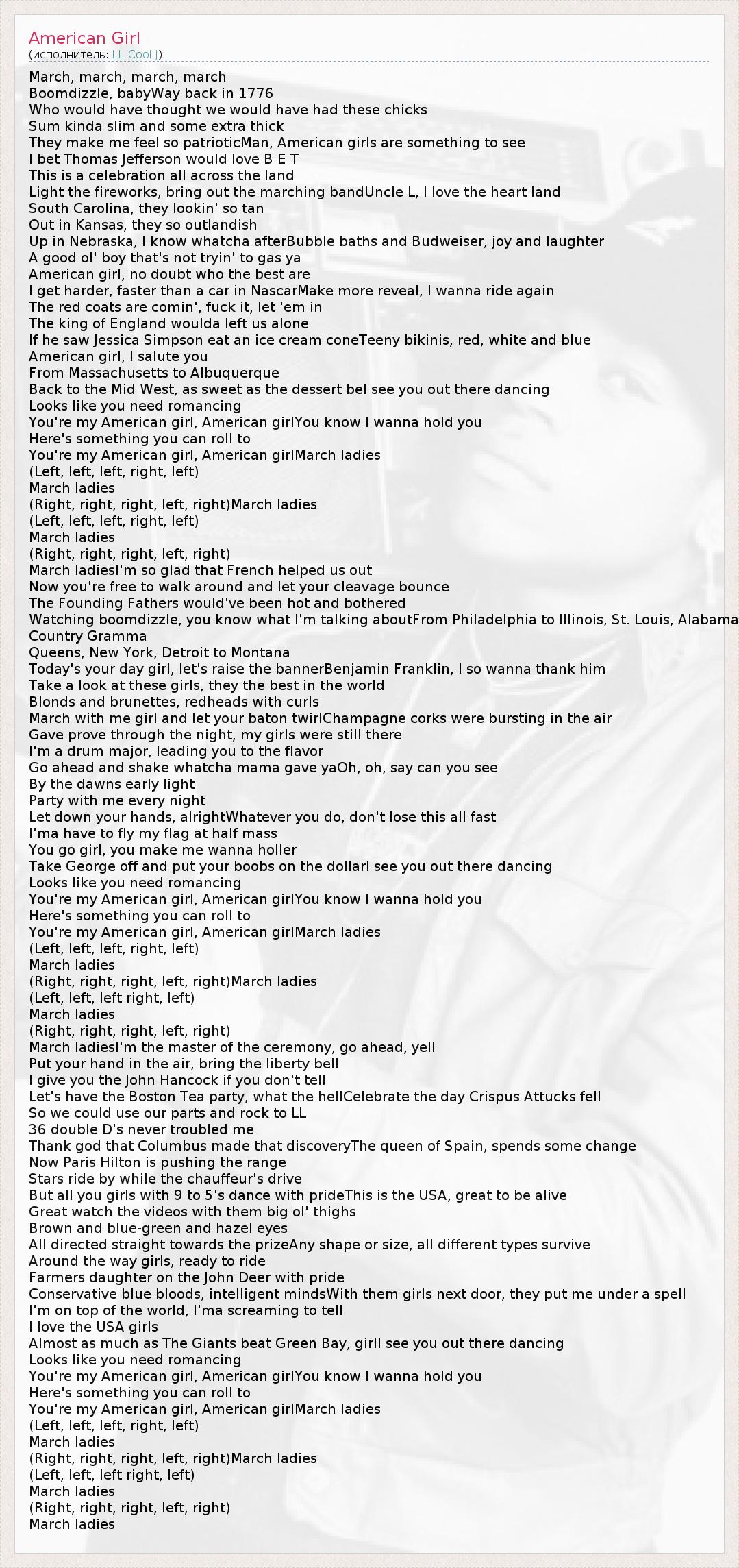 March, march, march, march Boomdizzle, babyWay back in 1776 Who would have thought we would have had these chicks Sum kinda slim and some extra thick They make me feel so patrioticMan, American girls are something to see I bet Thomas Jefferson would love B E T This is a celebration all across the land Light the fireworks, bring out the marching bandUncle L, I love the heart land South Carolina, they lookin' so tan Out in Kansas, they so outlandish Up in Nebraska, I know whatcha afterBubble baths and Budweiser, joy and laughter A good ol' boy that's not tryin' to gas ya American girl, no doubt who the best are I get harder, faster than a car in NascarMake more reveal, I wanna ride again The red coats are comin', fuck it, let 'em in The king of England woulda left us alone If he saw Jessica Simpson eat an ice cream coneTeeny bikinis, red, white and blue American girl, I salute you From Massachusetts to Albuquerque Back to the Mid West, as sweet as the dessert beI see you out there dancing Looks like you need romancing You're my American girl, American girlYou know I wanna hold you Here's something you can roll to You're my American girl, American girlMarch ladies (Left, left, left, right, left) March ladies (Right, right, right, left, right)March ladies (Left, left, left, right, left) March ladies (Right, right, right, left, right) March ladiesI'm so glad that French helped us out Now you're free to walk around and let your cleavage bounce The Founding Fathers would've been hot and bothered Watching boomdizzle, you know what I'm talking aboutFrom Philadelphia to Illinois, St. Louis, Alabama Country Gramma Queens, New York, Detroit to Montana Today's your day girl, let's raise the bannerBenjamin Franklin, I so wanna thank him Take a look at these girls, they the best in the world Blonds and brunettes, redheads with curls March with me girl and let your baton twirlChampagne corks were bursting in the air Gave prove through the night, my girls were still there I'm a drum major, leading you to the flavor Go ahead and shake whatcha mama gave yaOh, oh, say can you see By the dawns early light Party with me every night Let down your hands, alrightWhatever you do, don't lose this all fast I'ma have to fly my flag at half mass You go girl, you make me wanna holler Take George off and put your boobs on the dollarI see you out there dancing Looks like you need romancing You're my American girl, American girlYou know I wanna hold you Here's something you can roll to You're my American girl, American girlMarch ladies (Left, left, left, right, left) March ladies (Right, right, right, left, right)March ladies (Left, left, left right, left) March ladies (Right, right, right, left, right) March ladiesI'm the master of the ceremony, go ahead, yell Put your hand in the air, bring the liberty bell I give you the John Hancock if you don't tell Let's have the Boston Tea party, what the hellCelebrate the day Crispus Attucks fell So we could use our parts and rock to LL 36 double D's never troubled me Thank god that Columbus made that discoveryThe queen of Spain, spends some change Now Paris Hilton is pushing the range Stars ride by while the chauffeur's drive But all you girls with 9 to 5's dance with prideThis is the USA, great to be alive Great watch the videos with them big ol' thighs Brown and blue-green and hazel eyes All directed straight towards the prizeAny shape or size, all different types survive Around the way girls, ready to ride Farmers daughter on the John Deer with pride Conservative blue bloods, intelligent mindsWith them girls next door, they put me under a spell I'm on top of the world, I'ma screaming to tell I love the USA girls Almost as much as The Giants beat Green Bay, girlI see you out there dancing Looks like you need romancing You're my American girl, American girlYou know I wanna hold you Here's something you can roll to You're my American girl, American girlMarch ladies (Left, left, left, right, left) March ladies (Right, right, right, left, right)March ladies (Left, left, left right, left) March ladies (Right, right, right, left, right) March ladies