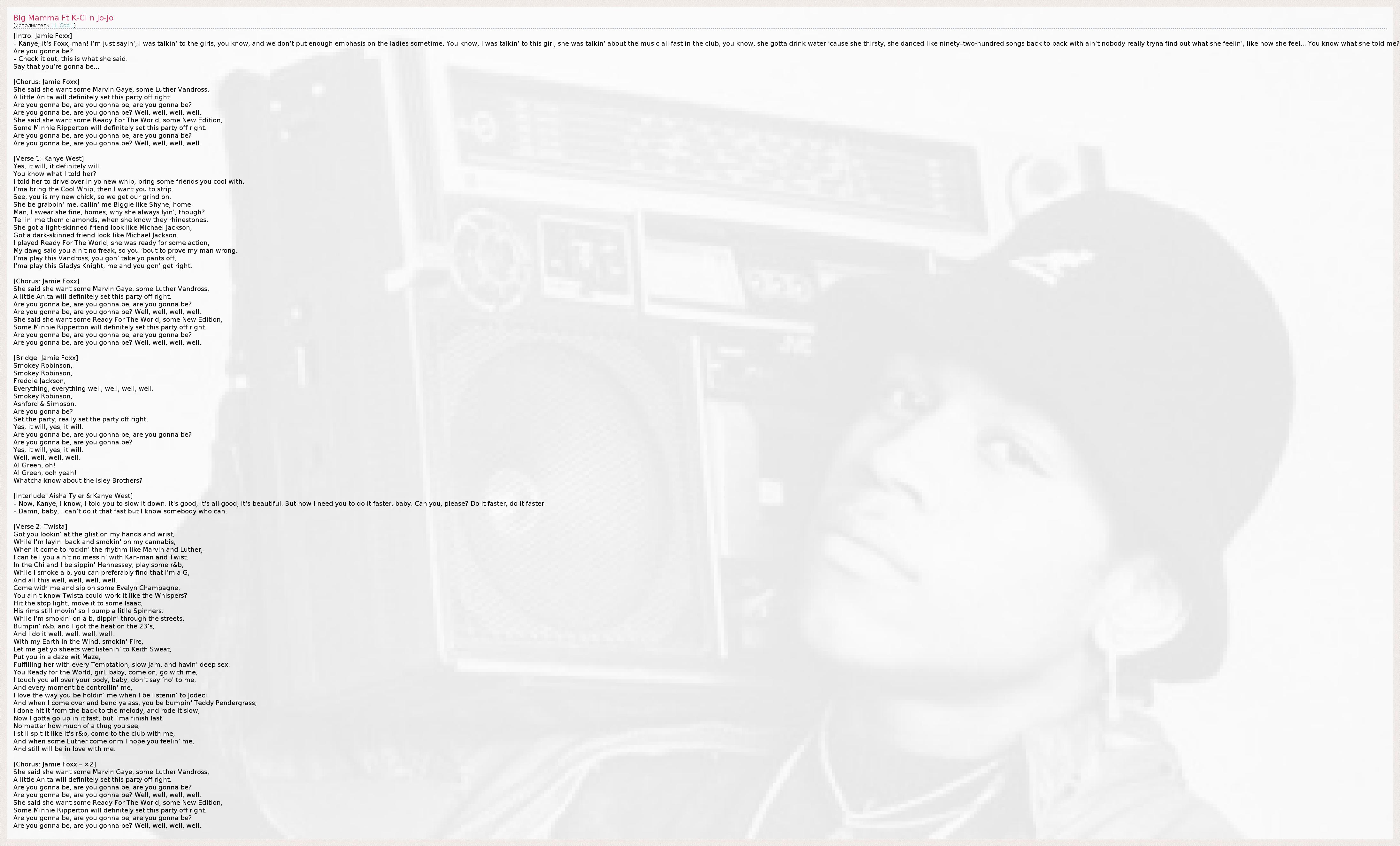 –	Kanye, it's Foxx, man! I'm just sayin', I was talkin' to the girls, you know, and we don't put enough emphasis on the ladies sometime. You know, I was talkin' to this girl, she was talkin' about the music all fast in the club, you know, she gotta drink water ‘cause she thirsty, she danced like ninety–two-hundred songs back to back with ain't nobody really tryna find out what she feelin', like how she feel... You know what she told me?