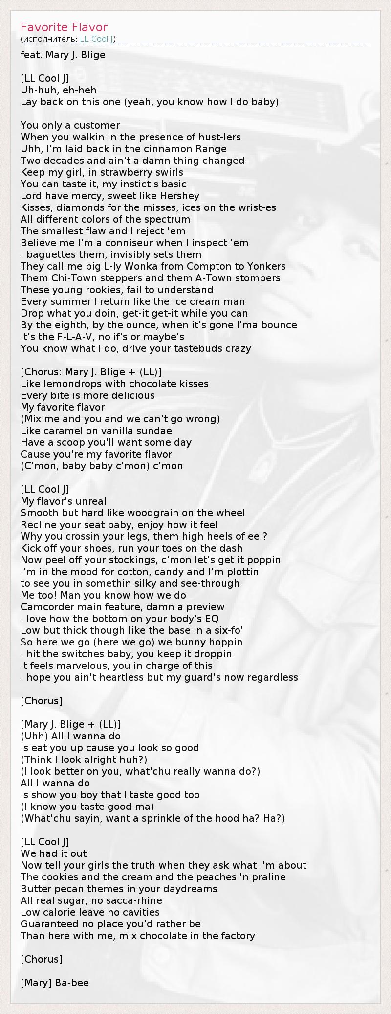 feat. Mary J. Blige [LL Cool J] Uh-huh, eh-heh Lay back on this one (yeah, you know how I do baby) You only a customer When you walkin in the presence of hust-lers Uhh, I'm laid back in the cinnamon Range Two decades and ain't a damn thing changed Keep my girl, in strawberry swirls You can taste it, my instict's basic Lord have mercy, sweet like Hershey Kisses, diamonds for the misses, ices on the wrist-es All different colors of the spectrum The smallest flaw and I reject 'em Believe me I'm a conniseur when I inspect 'em I baguettes them, invisibly sets them They call me big L-ly Wonka from Compton to Yonkers Them Chi-Town steppers and them A-Town stompers These young rookies, fail to understand Every summer I return like the ice cream man Drop what you doin, get-it get-it while you can By the eighth, by the ounce, when it's gone I'ma bounce It's the F-L-A-V, no if's or maybe's You know what I do, drive your tastebuds crazy [Chorus: Mary J. Blige + (LL)] Like lemondrops with chocolate kisses Every bite is more delicious My favorite flavor (Mix me and you and we can't go wrong) Like caramel on vanilla sundae Have a scoop you'll want some day Cause you're my favorite flavor (C'mon, baby baby c'mon) c'mon [LL Cool J] My flavor's unreal Smooth but hard like woodgrain on the wheel Recline your seat baby, enjoy how it feel Why you crossin your legs, them high heels of eel? Kick off your shoes, run your toes on the dash Now peel off your stockings, c'mon let's get it poppin I'm in the mood for cotton, candy and I'm plottin to see you in somethin silky and see-through Me too! Man you know how we do Camcorder main feature, damn a preview I love how the bottom on your body's EQ Low but thick though like the base in a six-fo' So here we go (here we go) we bunny hoppin I hit the switches baby, you keep it droppin It feels marvelous, you in charge of this I hope you ain't heartless but my guard's now regardless [Chorus] [Mary J. Blige + (LL)] (Uhh) All I wanna do Is eat you up cause you look so good (Think I look alright huh?) (I look better on you, what'chu really wanna do?) All I wanna do Is show you boy that I taste good too (I know you taste good ma) (What'chu sayin, want a sprinkle of the hood ha? Ha?) [LL Cool J] We had it out Now tell your girls the truth when they ask what I'm about The cookies and the cream and the peaches 'n praline Butter pecan themes in your daydreams All real sugar, no sacca-rhine Low calorie leave no cavities Guaranteed no place you'd rather be Than here with me, mix chocolate in the factory [Chorus] [Mary] Ba-bee