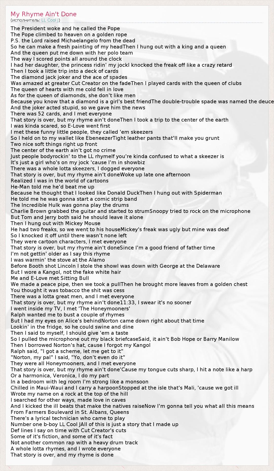 The President woke and he called the Pope The Pope climbed to heaven on a golden rope P.S. the Lord raised Michaelangelo from the dead So he can make a fresh painting of my headThen I hung out with a king and a queen And the queen put me down with her polo team The way I scored points all around the clock I had her daughter, the princess ridin' my jockI knocked the freak off like a crazy retard Then I took a little trip into a deck of cards The diamond jack joker and the ace of spades Was amazed at greater Cut Creator on the fadeThen I played cards with the queen of clubs The queen of hearts with me cold fell in love As for the queen of diamonds, she don't like men Because you know that a diamond is a girl's best friendThe double-trouble spade was named the deuce And the joker acted stupid, so we gave him the news There was 52 cards, and I met everyone That story is over, but my rhyme ain't doneThen I took a trip to the center of the earth I was kinda scared, so E-Love went first I met these funny little people, they called 'em skeezers So I held on to my wallet like EbeneezerTight leather pants that'll make you grunt Two nice soft things right up front The center of the earth ain't got no crime Just people bodyrockin' to the LL rhymeIf you're kinda confused to what a skeezer is It's just a girl who's on my jock 'cause I'm in showbiz There was a whole lotta skeezers, I dogged everyone That story is over, but my rhyme ain't doneWoke up late one afternoon Realized I was in the world of cartoons He-Man told me he'd beat me up Because he thought that I looked like Donald DuckThen I hung out with Spiderman He told me he was gonna start a comic strip band The Incredible Hulk was gonna play the drums Charlie Brown grabbed the guitar and started to strumSnoopy tried to rock on the microphone But Tom and Jerry both said he should leave it alone Then I hung out with Mickey Mouse He had two freaks, so we went to his houseMickey's freak was ugly but mine was deaf So I knocked it off until there wasn't none left They were cartoon characters, I met everyone That story is over, but my rhyme ain't doneSince I'm a good friend of father time I'm not gettin' older as I say this rhyme I was warmin' the stove at the Alamo Before Booth shot Lincoln I stole the showI was down with George at the Delaware But I wore a Kangol, not the fake white hair Me and E-Love met Sitting Bull We made a peace pipe, then we took a pullThen he brought more leaves from a golden chest You thought it was tobacco the shit was cess There was a lotta great men, and I met everyone That story is over, but my rhyme ain't done11:33, I swear it's no sooner I went inside my TV, I met 'The Honeymooners' Ralph wanted me to bust a couple of rhymes But I had my eyes on Alice's behindNorton came down right about that time Lookin' in the fridge, so he could swine and dine Then I said to myself, I should give 'em a taste So I pulled the microphone out my black briefcaseSaid, it ain't Bob Hope or Barry Manilow Then I borrowed Norton's hat, cause I forgot my Kangol Ralph said, "I got a scheme, let me get to it" "Norton, my pal" I said, "Yo, don't even do it" They were all Honeymooners, and I met everyone That story is over, but my rhyme ain't done'Cause my tongue cuts sharp, I hit a note like a harp Or a harmonica, Veronica, I do my part In a bedroom with leg room I'm strong like a monsoon Chilled in Maui-Waui and I carry a harpoonStopped at the isle that's Mali, 'cause we got ill Wrote my name on a rock at the top of the hill I searched for other ways, made love in caves And I kicked the ill beats that make the natives raiseNow I'm gonna tell you what all this means From Farmers Boulevard in St. Albans, Queens There's a lyrical technician who came to play Number one b-boy LL Cool JAll of this is just a story that I made up Def lines I say on time with Cut Creator's cuts Some of it's fiction, and some of it's fact Not another common rap with a heavy drum track A whole lotta rhymes, and I wrote everyone That story is over, and my rhyme is done
