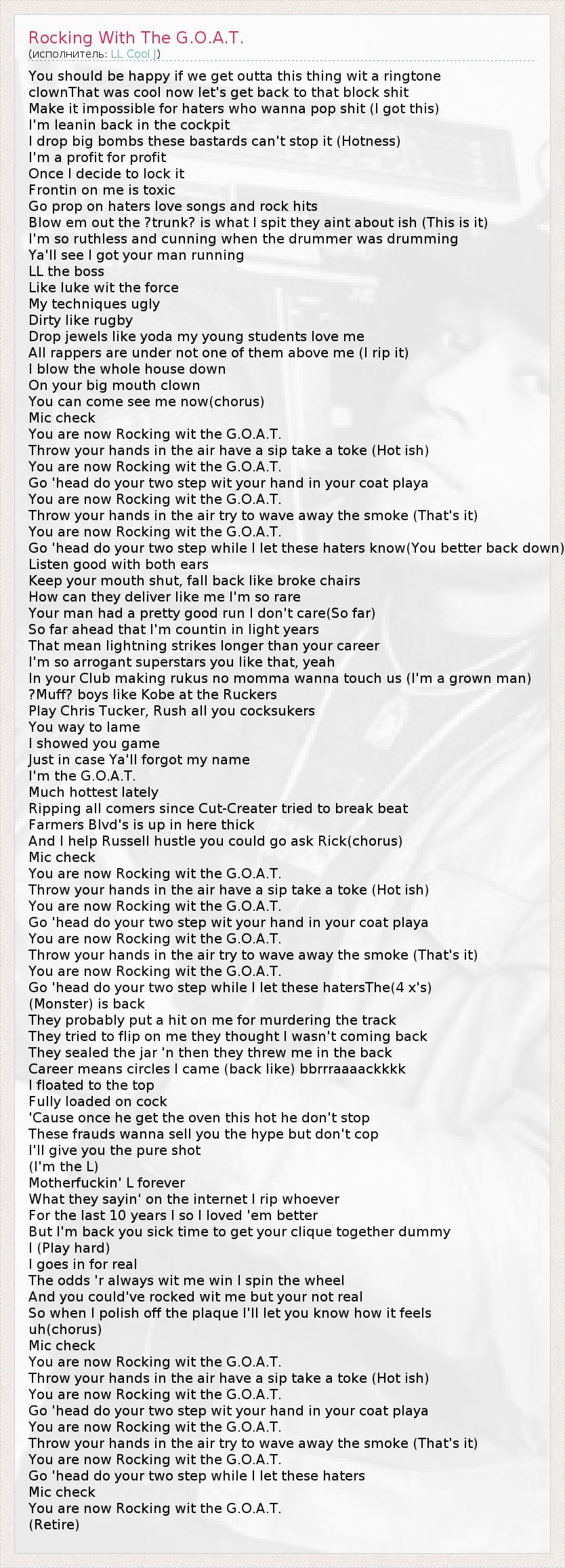 You should be happy if we get outta this thing wit a ringtone clownThat was cool now let's get back to that block shit Make it impossible for haters who wanna pop shit (I got this) I'm leanin back in the cockpit I drop big bombs these bastards can't stop it (Hotness) I'm a profit for profit Once I decide to lock it Frontin on me is toxic Go prop on haters love songs and rock hits Blow em out the ?trunk? is what I spit they aint about ish (This is it) I'm so ruthless and cunning when the drummer was drumming Ya'll see I got your man running LL the boss Like luke wit the force My techniques ugly Dirty like rugby Drop jewels like yoda my young students love me All rappers are under not one of them above me (I rip it) I blow the whole house down On your big mouth clown You can come see me now(chorus) Mic check You are now Rocking wit the G.O.A.T. Throw your hands in the air have a sip take a toke (Hot ish) You are now Rocking wit the G.O.A.T. Go 'head do your two step wit your hand in your coat playa You are now Rocking wit the G.O.A.T. Throw your hands in the air try to wave away the smoke (That's it) You are now Rocking wit the G.O.A.T. Go 'head do your two step while I let these haters know(You better back down) Listen good with both ears Keep your mouth shut, fall back like broke chairs How can they deliver like me I'm so rare Your man had a pretty good run I don't care(So far) So far ahead that I'm countin in light years That mean lightning strikes longer than your career I'm so arrogant superstars you like that, yeah In your Club making rukus no momma wanna touch us (I'm a grown man) ?Muff? boys like Kobe at the Ruckers Play Chris Tucker, Rush all you cocksukers You way to lame I showed you game Just in case Ya'll forgot my name I'm the G.O.A.T. Much hottest lately Ripping all comers since Cut-Creater tried to break beat Farmers Blvd's is up in here thick And I help Russell hustle you could go ask Rick(chorus) Mic check You are now Rocking wit the G.O.A.T. Throw your hands in the air have a sip take a toke (Hot ish) You are now Rocking wit the G.O.A.T. Go 'head do your two step wit your hand in your coat playa You are now Rocking wit the G.O.A.T. Throw your hands in the air try to wave away the smoke (That's it) You are now Rocking wit the G.O.A.T. Go 'head do your two step while I let these hatersThe(4 x's) (Monster) is back They probably put a hit on me for murdering the track They tried to flip on me they thought I wasn't coming back They sealed the jar 'n then they threw me in the back Career means circles I came (back like) bbrrraaaackkkk I floated to the top Fully loaded on cock 'Cause once he get the oven this hot he don't stop These frauds wanna sell you the hype but don't cop I'll give you the pure shot (I'm the L) Motherfuckin' L forever What they sayin' on the internet I rip whoever For the last 10 years I so I loved 'em better But I'm back you sick time to get your clique together dummy I (Play hard) I goes in for real The odds 'r always wit me win I spin the wheel And you could've rocked wit me but your not real So when I polish off the plaque I'll let you know how it feels uh(chorus) Mic check You are now Rocking wit the G.O.A.T. Throw your hands in the air have a sip take a toke (Hot ish) You are now Rocking wit the G.O.A.T. Go 'head do your two step wit your hand in your coat playa You are now Rocking wit the G.O.A.T. Throw your hands in the air try to wave away the smoke (That's it) You are now Rocking wit the G.O.A.T. Go 'head do your two step while I let these haters Mic check You are now Rocking wit the G.O.A.T. (Retire)