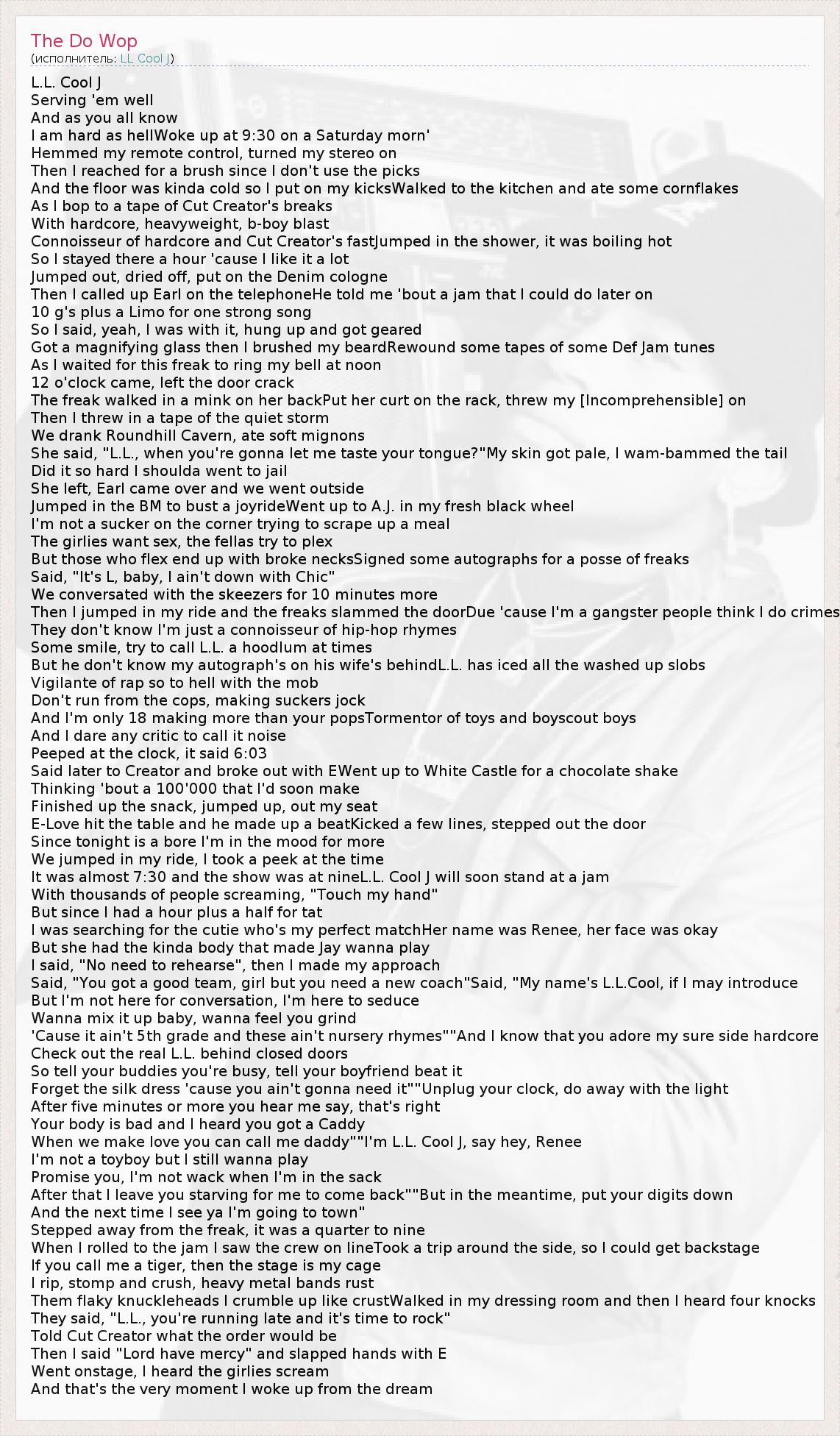 She said, "L.L., when you're gonna let me taste your tongue?"My skin got pale, I wam-bammed the tail