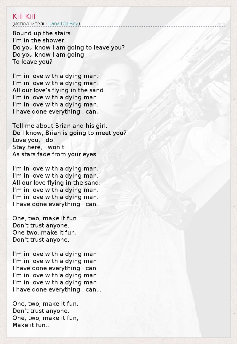 Ты поднялся по лестнице. Я в душе. Ты знаешь, что я собираюсь с тобой расстаться? Ты знаешь, что я собираюсь От тебя уйти? Я влюблена в умирающего человека. Я влюблена в умирающего человека. Наша любовь превратилась в прах. Я влюблена в умирающего человека. Я влюблена в умирающего человека. Я сделала всё, что в моих силах. Расскажи мне о Брайане и его девушке. Знаю ли я, что Брайан собирается встретиться с тобой? Люблю тебя, правда, Остаться? Нет, я уйду, Пока ты не придёшь в себя. 1 Я влюблена в умирающего человека. Я влюблена в умирающего человека. Наша любовь превратилась в прах. Я влюблена в умирающего человека. Я влюблена в умирающего человека. Я сделала всё, что в моих силах. Раз, два, забавляйся, Никому не доверяй! Раз, два, забавляйся, Никому не доверяй! Я влюблена в умирающего человека. Я влюблена в умирающего человека. Наша любовь превратилась в прах. Я влюблена в умирающего человека. Я влюблена в умирающего человека. Я сделала всё, что в моих силах... Раз, два, забавляйся, Никому не доверяй! Раз, два, забавляйся, Забавляйся... 1 - дословно: когда перестанешь видеть звёздочки