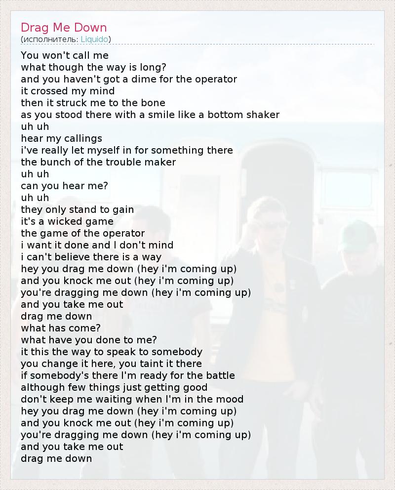 You won't call me what though the way is long? and you haven't got a dime for the operator it crossed my mind then it struck me to the bone as you stood there with a smile like a bottom shaker uh uh hear my callings i've really let myself in for something there the bunch of the trouble maker uh uh can you hear me? uh uh they only stand to gain it's a wicked game the game of the operator i want it done and I don't mind i can't believe there is a way hey you drag me down (hey i'm coming up) and you knock me out (hey i'm coming up) you're dragging me down (hey i'm coming up) and you take me out drag me down what has come? what have you done to me? it this the way to speak to somebody you change it here, you taint it there if somebody's there I'm ready for the battle although few things just getting good don't keep me waiting when I'm in the mood hey you drag me down (hey i'm coming up) and you knock me out (hey i'm coming up) you're dragging me down (hey i'm coming up) and you take me out drag me down