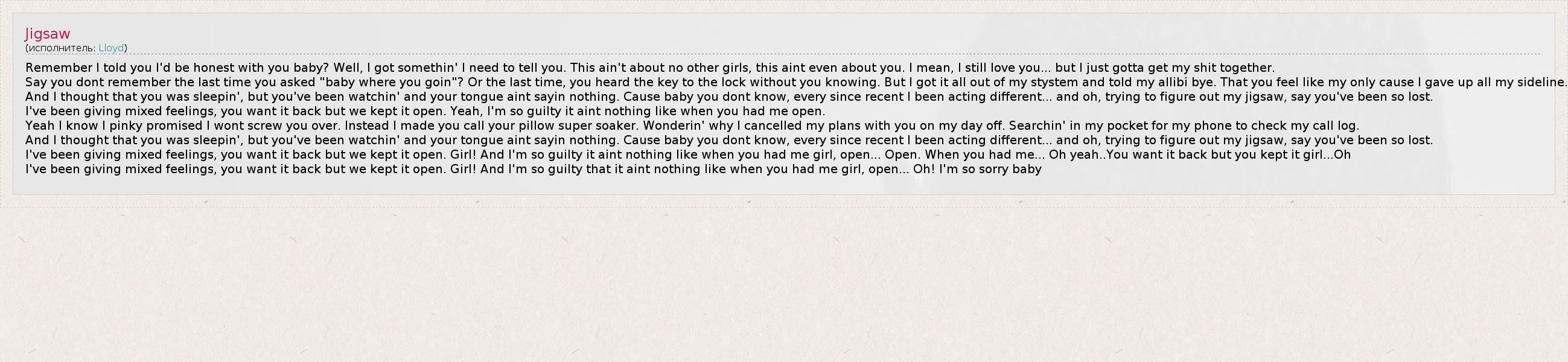 I've been giving mixed feelings, you want it back but we kept it open. Girl! And I'm so guilty that it aint nothing like when you had me girl, open... Oh! I'm so sorry baby