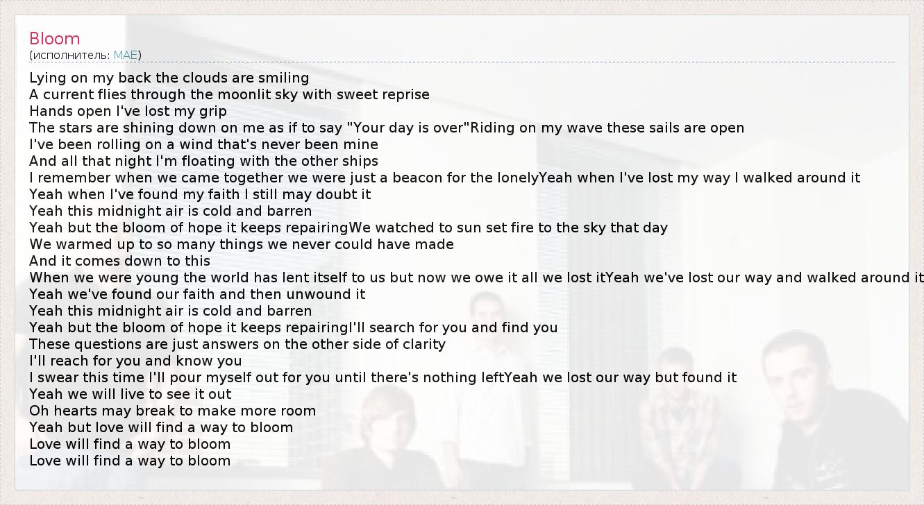 Это интересно:Группа "Mae" была образована в 2001-м в Норфолке (штат Виржиния). Название Mae - это аббревиатура Multisensory Aesthetic Experience, и эти “мульти-сенсорные эстеты” привнесли своих красок в квази-имо-ветку, выросшую на почве увядающего имо-рока.Почти все они были связаны с музыкой с самого детства. Иаков родился в семье хиппи (эстетских), и с раннего детства в их доме звучала музыка с утра до ночи. Зак... продолжение