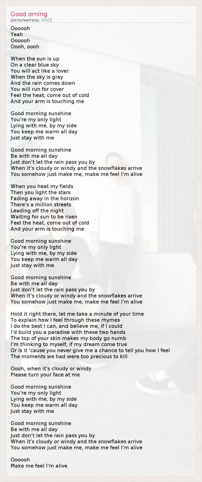 Это интересно:Группа "Mae" была образована в 2001-м в Норфолке (штат Виржиния). Название Mae - это аббревиатура Multisensory Aesthetic Experience, и эти “мульти-сенсорные эстеты” привнесли своих красок в квази-имо-ветку, выросшую на почве увядающего имо-рока.Почти все они были связаны с музыкой с самого детства. Иаков родился в семье хиппи (эстетских), и с раннего детства в их доме звучала музыка с утра до ночи. Зак... продолжение