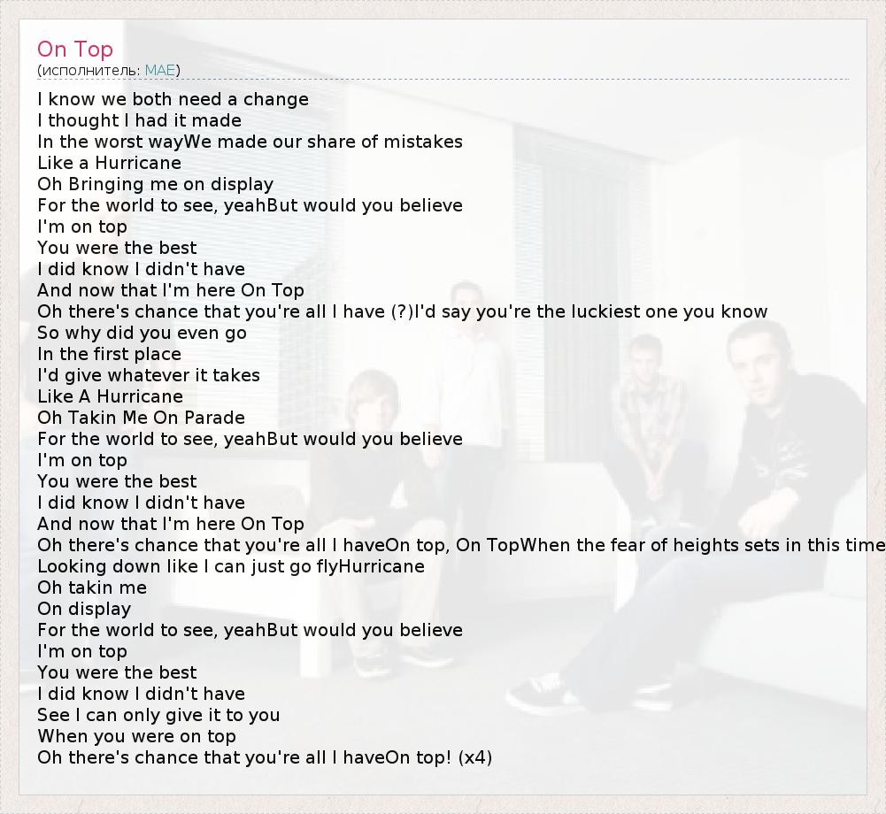 Oh there's chance that you're all I haveOn top, On TopWhen the fear of heights sets in this time