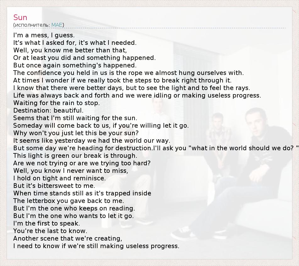 Это интересно:Группа "Mae" была образована в 2001-м в Норфолке (штат Виржиния). Название Mae - это аббревиатура Multisensory Aesthetic Experience, и эти “мульти-сенсорные эстеты” привнесли своих красок в квази-имо-ветку, выросшую на почве увядающего имо-рока.Почти все они были связаны с музыкой с самого детства. Иаков родился в семье хиппи (эстетских), и с раннего детства в их доме звучала музыка с утра до ночи. Зак... продолжение