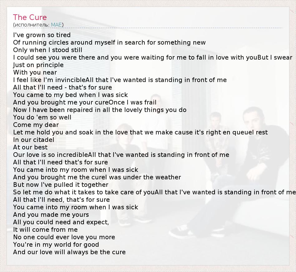 I've grown so tired Of running circles around myself in search for something new Only when I stood still I could see you were there and you were waiting for me to fall in love with youBut I swear Just on principle With you near I feel like I'm invincibleAll that I've wanted is standing in front of me All that I'll need - that's for sure You came to my bed when I was sick And you brought me your cureOnce I was frail Now I have been repaired in all the lovely things you do You do 'em so well Come my dear Let me hold you and soak in the love that we make cause it's right en queueI rest In our citadel At our best Our love is so incredibleAll that I've wanted is standing in front of me All that I'll need that's for sure You came into my room when I was sick And you brought me the cureI was under the weather But now I've pulled it together So let me do what it takes to take care of youAll that I've wanted is standing in front of me All that I'll need, that's for sure You came into my room when I was sick And you made me yours All you could need and expect, It will come from me No one could ever love you more You're in my world for good And our love will always be the cure