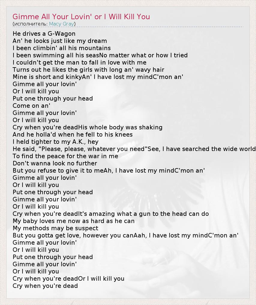 He drives a G-Wagon An' he looks just like my dream I been climbin' all his mountains I been swimming all his seasNo matter what or how I tried I couldn't get the man to fall in love with me Turns out he likes the girls with long an' wavy hair Mine is short and kinkyAn' I have lost my mindC'mon an' Gimme all your lovin' Or I will kill you Put one through your head Come on an' Gimme all your lovin' Or I will kill you Cry when you're deadHis whole body was shaking And he holla'd when he fell to his knees I held tighter to my A.K., hey He said, "Please, please, whatever you need"See, I have searched the wide world To find the peace for the war in me Don't wanna look no further But you refuse to give it to meAh, I have lost my mindC'mon an' Gimme all your lovin' Or I will kill you Put one through your head Gimme all your lovin' Or I will kill you Cry when you're deadIt's amazing what a gun to the head can do My baby loves me now as hard as he can My methods may be suspect But you gotta get love, however you canAah, I have lost my mindC'mon an' Gimme all your lovin' Or I will kill you Put one through your head Gimme all your lovin' Or I will kill you Cry when you're deadOr I will kill you Cry when you're dead