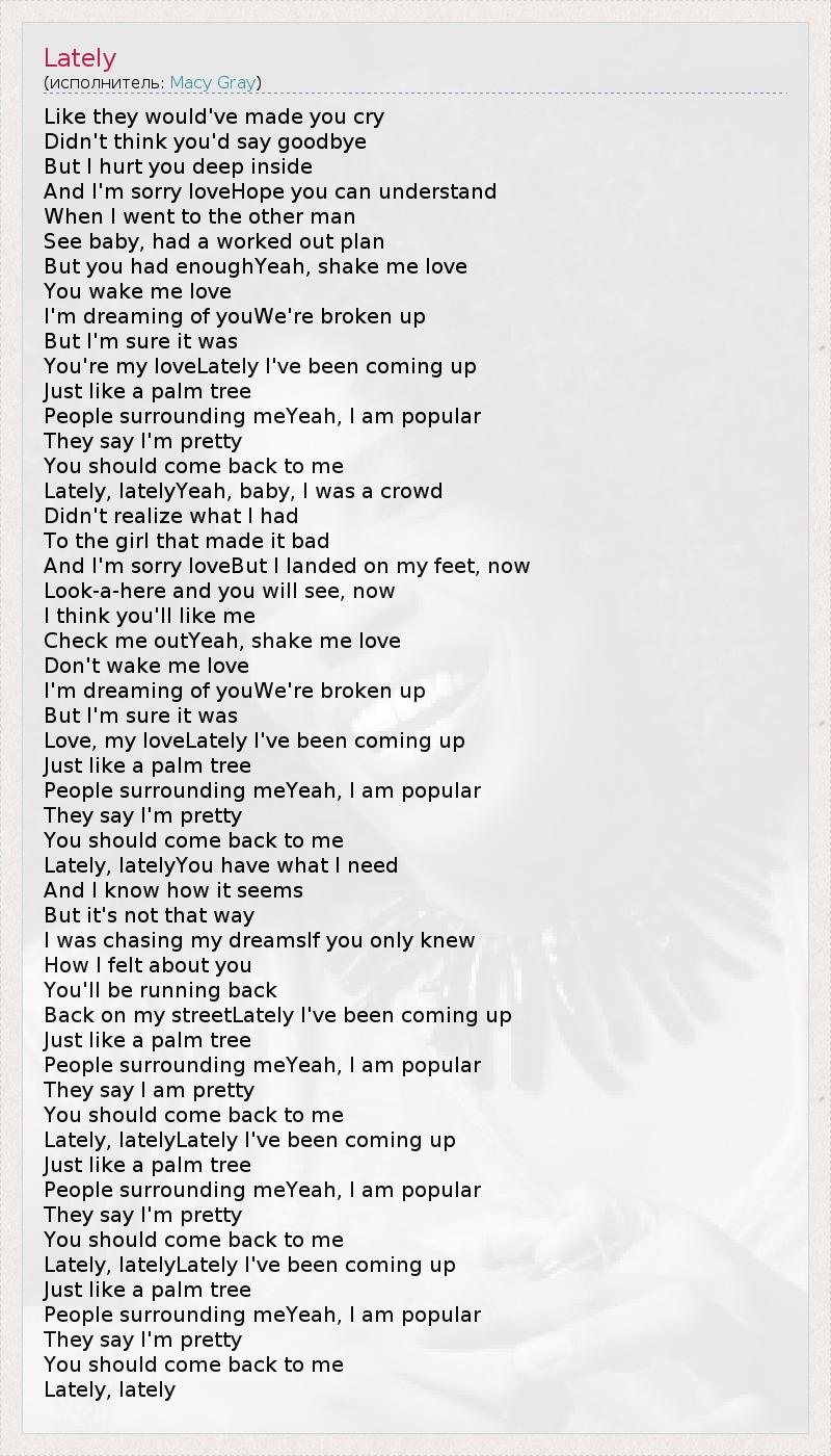 Like they would've made you cry Didn't think you'd say goodbye But I hurt you deep inside And I'm sorry loveHope you can understand When I went to the other man See baby, had a worked out plan But you had enoughYeah, shake me love You wake me love I'm dreaming of youWe're broken up But I'm sure it was You're my loveLately I've been coming up Just like a palm tree People surrounding meYeah, I am popular They say I'm pretty You should come back to me Lately, latelyYeah, baby, I was a crowd Didn't realize what I had To the girl that made it bad And I'm sorry loveBut I landed on my feet, now Look-a-here and you will see, now I think you'll like me Check me outYeah, shake me love Don't wake me love I'm dreaming of youWe're broken up But I'm sure it was Love, my loveLately I've been coming up Just like a palm tree People surrounding meYeah, I am popular They say I'm pretty You should come back to me Lately, latelyYou have what I need And I know how it seems But it's not that way I was chasing my dreamsIf you only knew How I felt about you You'll be running back Back on my streetLately I've been coming up Just like a palm tree People surrounding meYeah, I am popular They say I am pretty You should come back to me Lately, latelyLately I've been coming up Just like a palm tree People surrounding meYeah, I am popular They say I'm pretty You should come back to me Lately, latelyLately I've been coming up Just like a palm tree People surrounding meYeah, I am popular They say I'm pretty You should come back to me Lately, lately