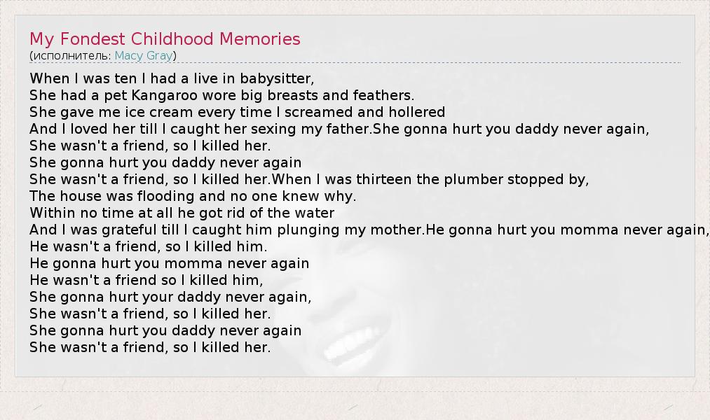 А как ты думаешь, о чем песня "My Fondest Childhood Memories" ?