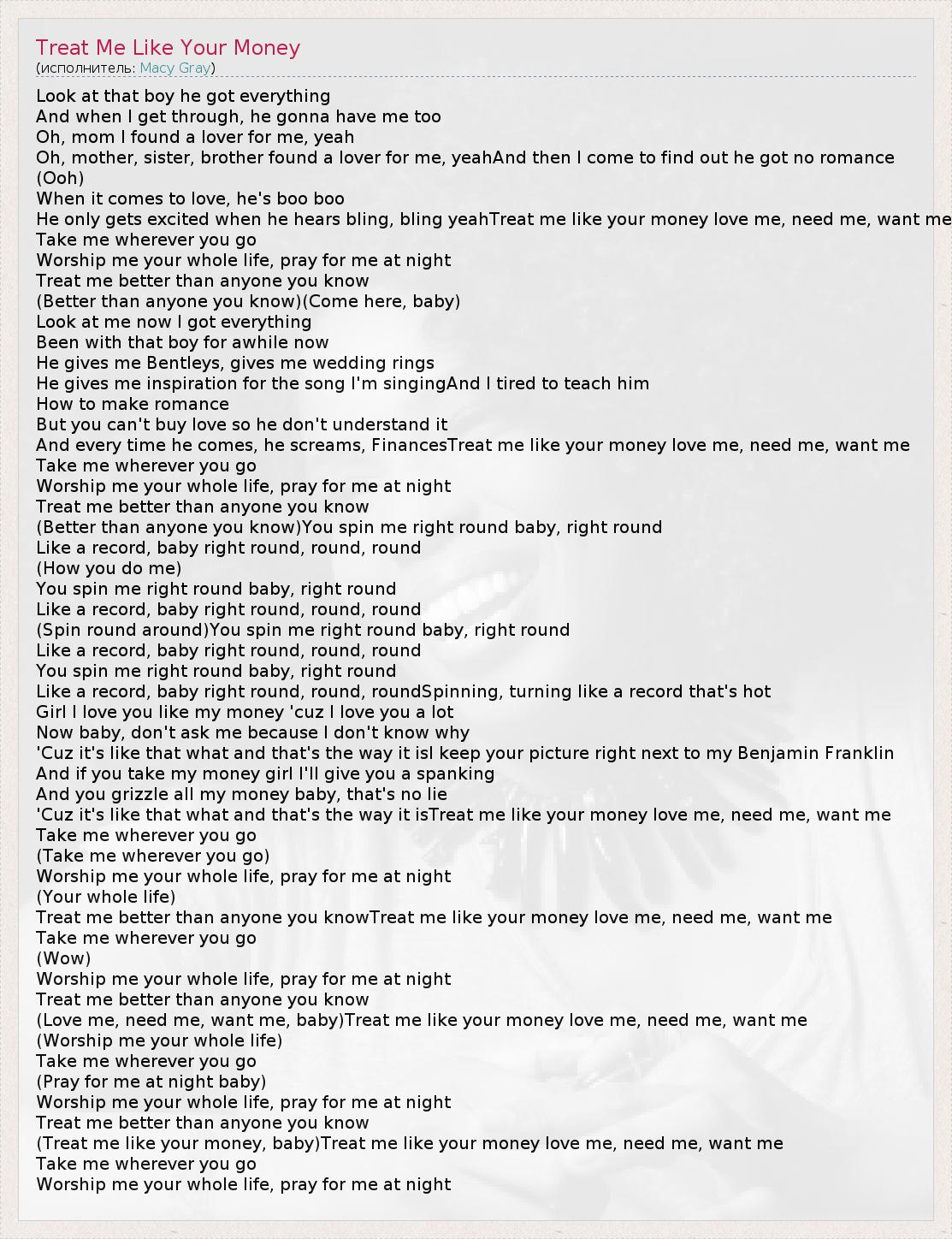 Look at that boy he got everything And when I get through, he gonna have me too Oh, mom I found a lover for me, yeah Oh, mother, sister, brother found a lover for me, yeahAnd then I come to find out he got no romance (Ooh) When it comes to love, he's boo boo He only gets excited when he hears bling, bling yeahTreat me like your money love me, need me, want me Take me wherever you go Worship me your whole life, pray for me at night Treat me better than anyone you know (Better than anyone you know)(Come here, baby) Look at me now I got everything Been with that boy for awhile now He gives me Bentleys, gives me wedding rings He gives me inspiration for the song I'm singingAnd I tired to teach him How to make romance But you can't buy love so he don't understand it And every time he comes, he screams, FinancesTreat me like your money love me, need me, want me Take me wherever you go Worship me your whole life, pray for me at night Treat me better than anyone you know (Better than anyone you know)You spin me right round baby, right round Like a record, baby right round, round, round (How you do me) You spin me right round baby, right round Like a record, baby right round, round, round (Spin round around)You spin me right round baby, right round Like a record, baby right round, round, round You spin me right round baby, right round Like a record, baby right round, round, roundSpinning, turning like a record that's hot Girl I love you like my money 'cuz I love you a lot Now baby, don't ask me because I don't know why 'Cuz it's like that what and that's the way it isI keep your picture right next to my Benjamin Franklin And if you take my money girl I'll give you a spanking And you grizzle all my money baby, that's no lie 'Cuz it's like that what and that's the way it isTreat me like your money love me, need me, want me Take me wherever you go (Take me wherever you go) Worship me your whole life, pray for me at night (Your whole life) Treat me better than anyone you knowTreat me like your money love me, need me, want me Take me wherever you go (Wow) Worship me your whole life, pray for me at night Treat me better than anyone you know (Love me, need me, want me, baby)Treat me like your money love me, need me, want me (Worship me your whole life) Take me wherever you go (Pray for me at night baby) Worship me your whole life, pray for me at night Treat me better than anyone you know (Treat me like your money, baby)Treat me like your money love me, need me, want me Take me wherever you go Worship me your whole life, pray for me at night