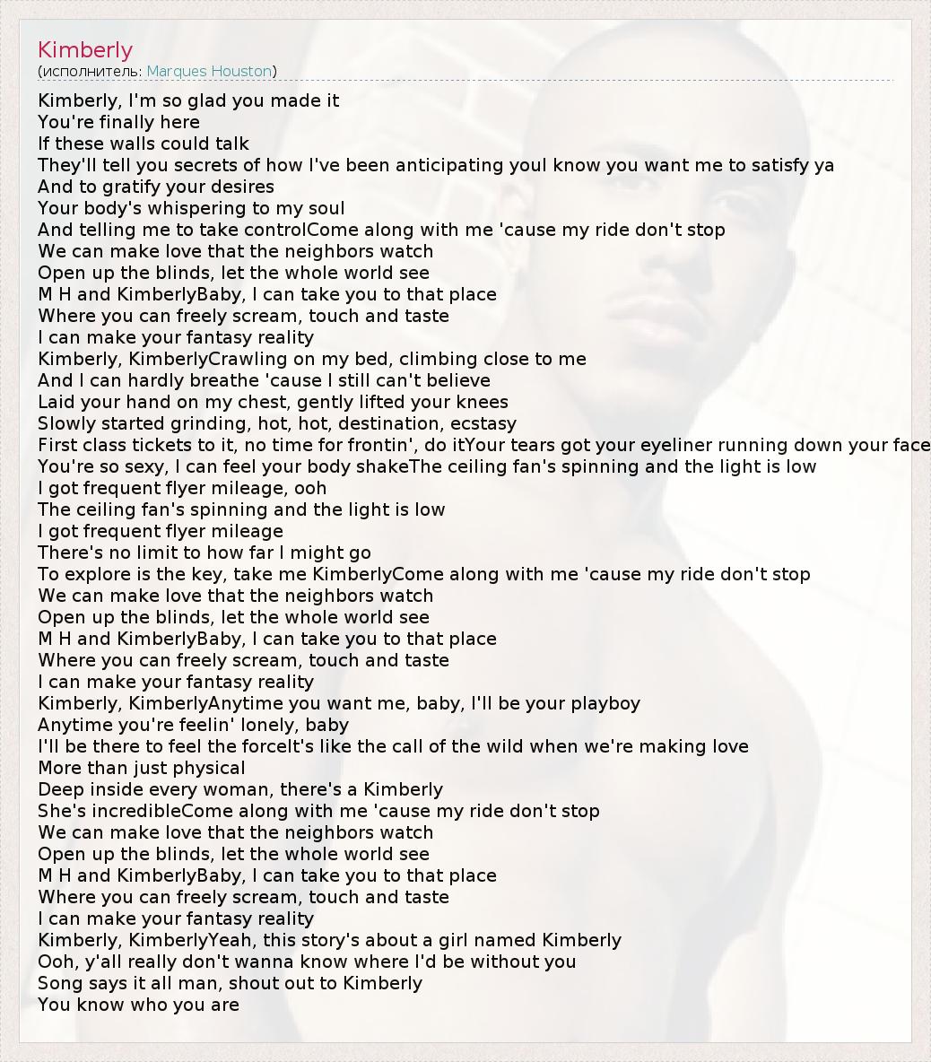 Kimberly, I'm so glad you made it You're finally here If these walls could talk They'll tell you secrets of how I've been anticipating youI know you want me to satisfy ya And to gratify your desires Your body's whispering to my soul And telling me to take controlCome along with me 'cause my ride don't stop We can make love that the neighbors watch Open up the blinds, let the whole world see M H and KimberlyBaby, I can take you to that place Where you can freely scream, touch and taste I can make your fantasy reality Kimberly, KimberlyCrawling on my bed, climbing close to me And I can hardly breathe 'cause I still can't believe Laid your hand on my chest, gently lifted your knees Slowly started grinding, hot, hot, destination, ecstasy First class tickets to it, no time for frontin', do itYour tears got your eyeliner running down your face You're so sexy, I can feel your body shakeThe ceiling fan's spinning and the light is low I got frequent flyer mileage, ooh The ceiling fan's spinning and the light is low I got frequent flyer mileage There's no limit to how far I might go To explore is the key, take me KimberlyCome along with me 'cause my ride don't stop We can make love that the neighbors watch Open up the blinds, let the whole world see M H and KimberlyBaby, I can take you to that place Where you can freely scream, touch and taste I can make your fantasy reality Kimberly, KimberlyAnytime you want me, baby, I'll be your playboy Anytime you're feelin' lonely, baby I'll be there to feel the forceIt's like the call of the wild when we're making love More than just physical Deep inside every woman, there's a Kimberly She's incredibleCome along with me 'cause my ride don't stop We can make love that the neighbors watch Open up the blinds, let the whole world see M H and KimberlyBaby, I can take you to that place Where you can freely scream, touch and taste I can make your fantasy reality Kimberly, KimberlyYeah, this story's about a girl named Kimberly Ooh, y'all really don't wanna know where I'd be without you Song says it all man, shout out to Kimberly You know who you are