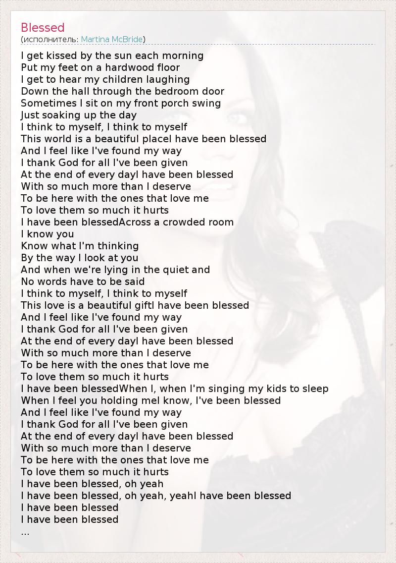 I get kissed by the sun each morning Put my feet on a hardwood floor I get to hear my children laughing Down the hall through the bedroom door Sometimes I sit on my front porch swing Just soaking up the day I think to myself, I think to myself This world is a beautiful placeI have been blessed And I feel like I've found my way I thank God for all I've been given At the end of every dayI have been blessed With so much more than I deserve To be here with the ones that love me To love them so much it hurts I have been blessedAcross a crowded room I know you Know what I'm thinking By the way I look at you And when we're lying in the quiet and No words have to be said I think to myself, I think to myself This love is a beautiful giftI have been blessed And I feel like I've found my way I thank God for all I've been given At the end of every dayI have been blessed With so much more than I deserve To be here with the ones that love me To love them so much it hurts I have been blessedWhen I, when I'm singing my kids to sleep When I feel you holding meI know, I've been blessed And I feel like I've found my way I thank God for all I've been given At the end of every dayI have been blessed With so much more than I deserve To be here with the ones that love me To love them so much it hurts I have been blessed, oh yeah I have been blessed, oh yeah, yeahI have been blessed I have been blessed I have been blessed ...
