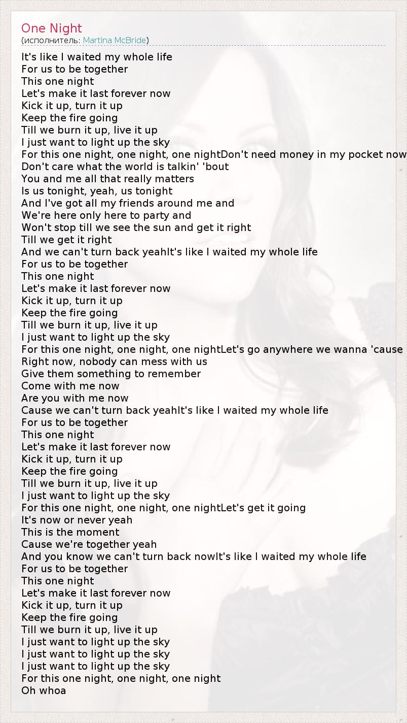 It's like I waited my whole life For us to be together This one night Let's make it last forever now Kick it up, turn it up Keep the fire going Till we burn it up, live it up I just want to light up the sky For this one night, one night, one nightDon't need money in my pocket now Don't care what the world is talkin' 'bout You and me all that really matters Is us tonight, yeah, us tonight And I've got all my friends around me and We're here only here to party and Won't stop till we see the sun and get it right Till we get it right And we can't turn back yeahIt's like I waited my whole life For us to be together This one night Let's make it last forever now Kick it up, turn it up Keep the fire going Till we burn it up, live it up I just want to light up the sky For this one night, one night, one nightLet's go anywhere we wanna 'cause Right now, nobody can mess with us Give them something to remember Come with me now Are you with me now Cause we can't turn back yeahIt's like I waited my whole life For us to be together This one night Let's make it last forever now Kick it up, turn it up Keep the fire going Till we burn it up, live it up I just want to light up the sky For this one night, one night, one nightLet's get it going It's now or never yeah This is the moment Cause we're together yeah And you know we can't turn back nowIt's like I waited my whole life For us to be together This one night Let's make it last forever now Kick it up, turn it up Keep the fire going Till we burn it up, live it up I just want to light up the sky I just want to light up the sky I just want to light up the sky For this one night, one night, one night Oh whoa