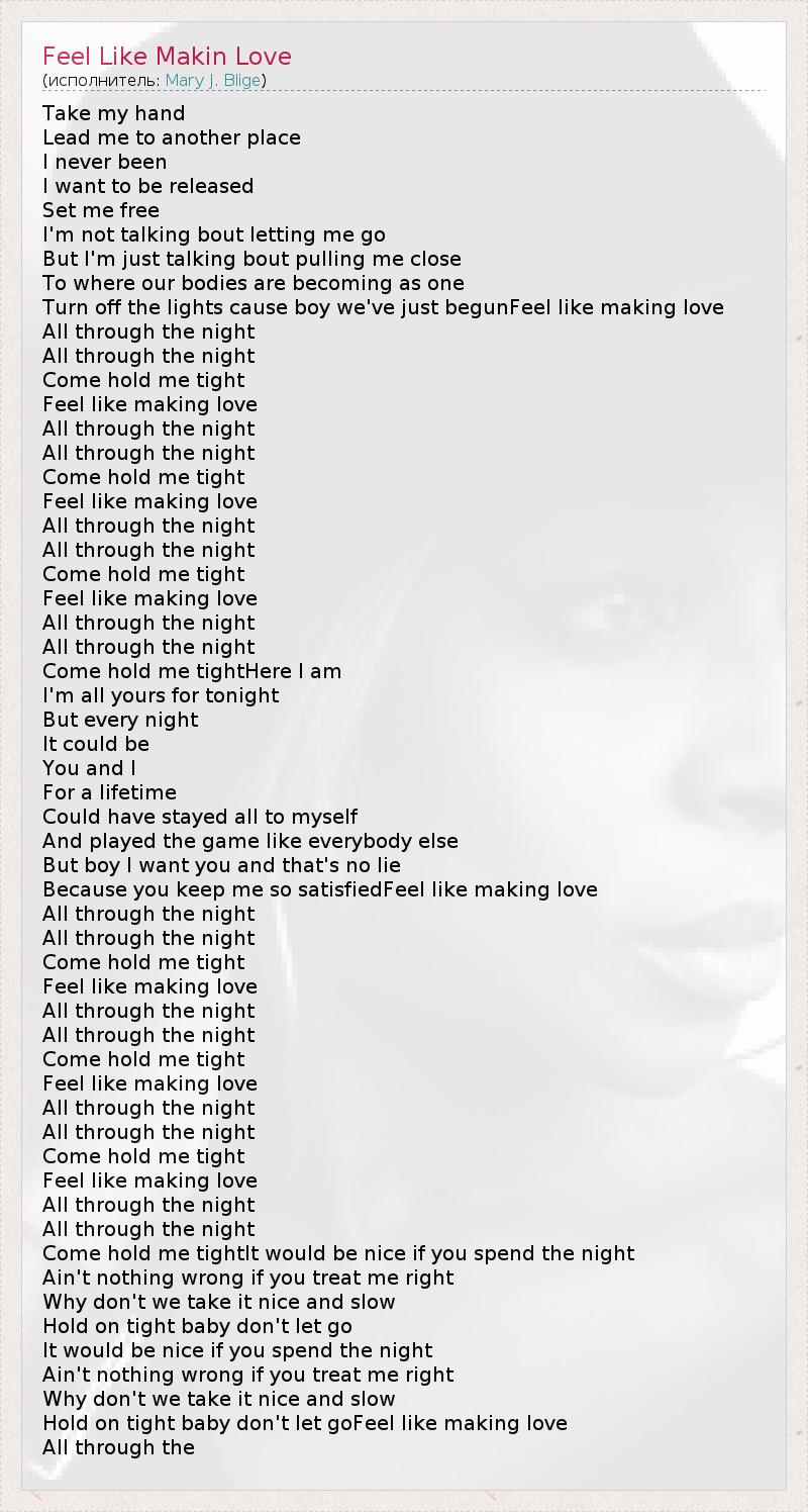 Take my hand Lead me to another place I never been I want to be released Set me free I'm not talking bout letting me go But I'm just talking bout pulling me close To where our bodies are becoming as one Turn off the lights cause boy we've just begunFeel like making love All through the night All through the night Come hold me tight Feel like making love All through the night All through the night Come hold me tight Feel like making love All through the night All through the night Come hold me tight Feel like making love All through the night All through the night Come hold me tightHere I am I'm all yours for tonight But every night It could be You and I For a lifetime Could have stayed all to myself And played the game like everybody else But boy I want you and that's no lie Because you keep me so satisfiedFeel like making love All through the night All through the night Come hold me tight Feel like making love All through the night All through the night Come hold me tight Feel like making love All through the night All through the night Come hold me tight Feel like making love All through the night All through the night Come hold me tightIt would be nice if you spend the night Ain't nothing wrong if you treat me right Why don't we take it nice and slow Hold on tight baby don't let go It would be nice if you spend the night Ain't nothing wrong if you treat me right Why don't we take it nice and slow Hold on tight baby don't let goFeel like making love All through the