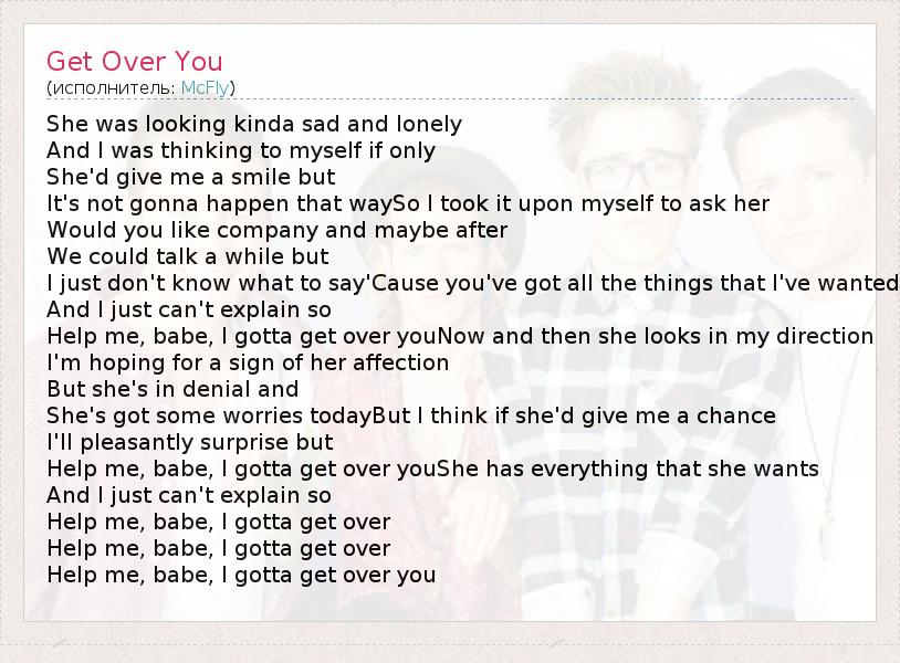 She was looking kinda sad and lonely And I was thinking to myself if only She'd give me a smile but It's not gonna happen that waySo I took it upon myself to ask her Would you like company and maybe after We could talk a while but I just don't know what to say'Cause you've got all the things that I've wanted And I just can't explain so Help me, babe, I gotta get over youNow and then she looks in my direction I'm hoping for a sign of her affection But she's in denial and She's got some worries todayBut I think if she'd give me a chance I'll pleasantly surprise but Help me, babe, I gotta get over youShe has everything that she wants And I just can't explain so Help me, babe, I gotta get over Help me, babe, I gotta get over Help me, babe, I gotta get over you