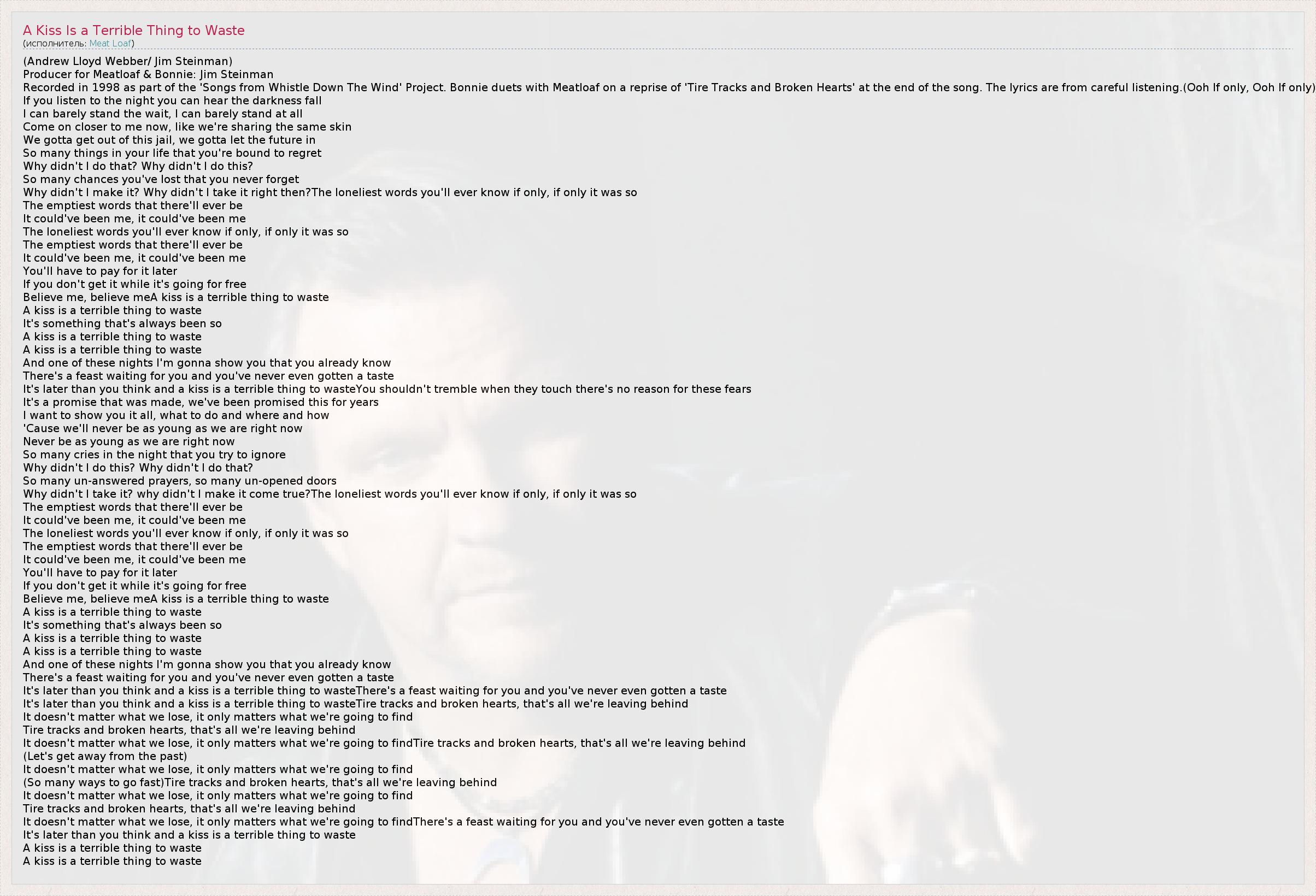 ГлавнаяИсполнителиMeat LoafA Kiss Is a Terrible Thing to Waste