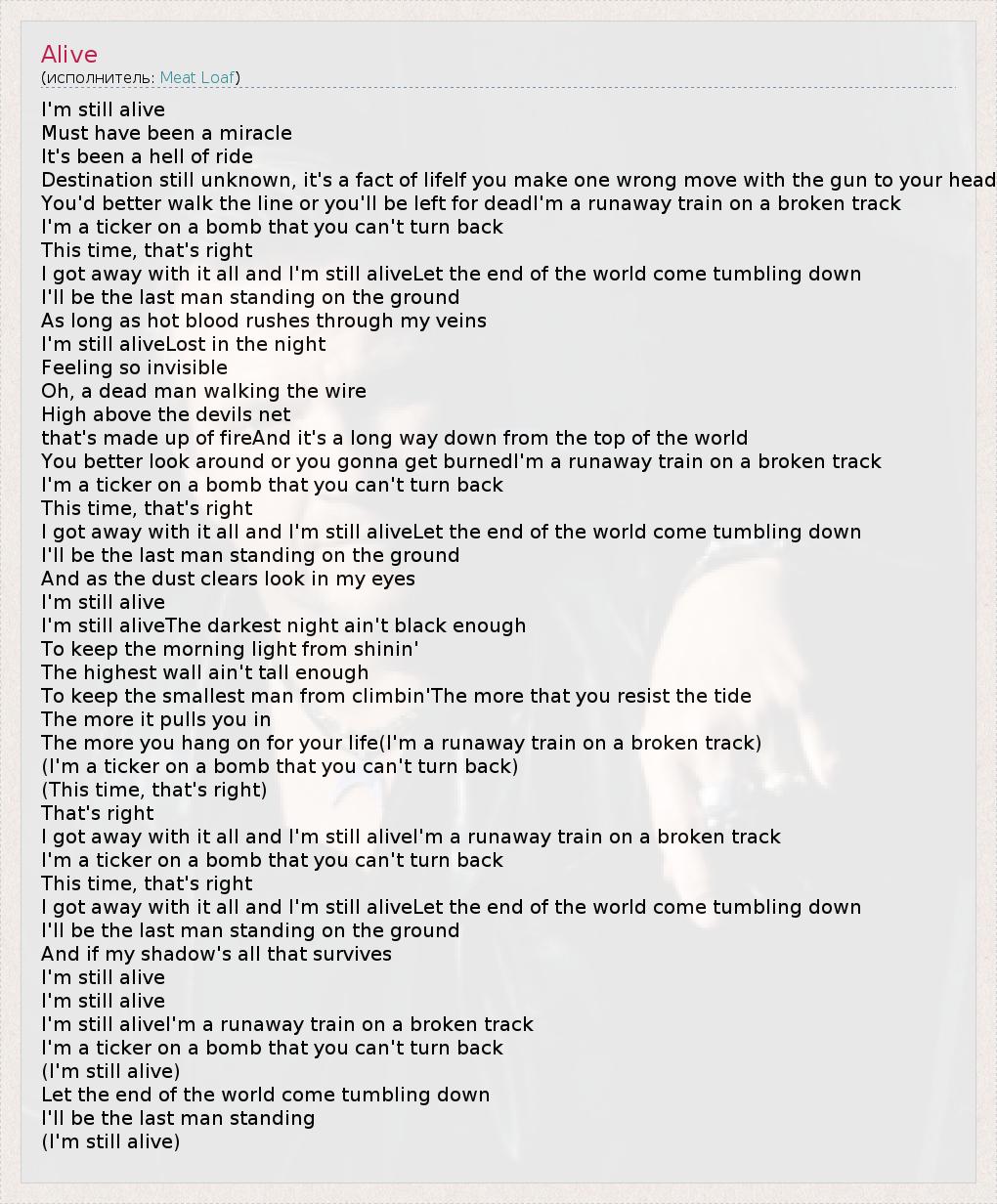 I'm still alive Must have been a miracle It's been a hell of ride Destination still unknown, it's a fact of lifeIf you make one wrong move with the gun to your head You'd better walk the line or you'll be left for deadI'm a runaway train on a broken track I'm a ticker on a bomb that you can't turn back This time, that's right I got away with it all and I'm still aliveLet the end of the world come tumbling down I'll be the last man standing on the ground As long as hot blood rushes through my veins I'm still aliveLost in the night Feeling so invisible Oh, a dead man walking the wire High above the devils net that's made up of fireAnd it's a long way down from the top of the world You better look around or you gonna get burnedI'm a runaway train on a broken track I'm a ticker on a bomb that you can't turn back This time, that's right I got away with it all and I'm still aliveLet the end of the world come tumbling down I'll be the last man standing on the ground And as the dust clears look in my eyes I'm still alive I'm still aliveThe darkest night ain't black enough To keep the morning light from shinin' The highest wall ain't tall enough To keep the smallest man from climbin'The more that you resist the tide The more it pulls you in The more you hang on for your life(I'm a runaway train on a broken track) (I'm a ticker on a bomb that you can't turn back) (This time, that's right) That's right I got away with it all and I'm still aliveI'm a runaway train on a broken track I'm a ticker on a bomb that you can't turn back This time, that's right I got away with it all and I'm still aliveLet the end of the world come tumbling down I'll be the last man standing on the ground And if my shadow's all that survives I'm still alive I'm still alive I'm still aliveI'm a runaway train on a broken track I'm a ticker on a bomb that you can't turn back (I'm still alive) Let the end of the world come tumbling down I'll be the last man standing (I'm still alive)