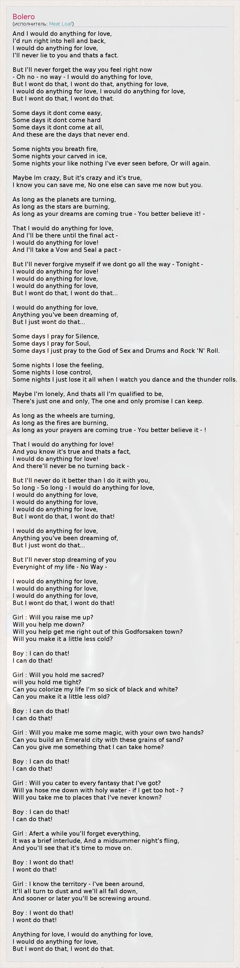 And I would do anything for love, I'd run right into hell and back, I would do anything for love, I'll never lie to you and thats a fact. But I'll never forget the way you feel right now - Oh no - no way - I would do anything for love, But I wont do that, I wont do that, anything for love, I would do anything for love, I would do anything for love, But I wont do that, I wont do that. Some days it dont come easy, Some days it dont come hard Some days it dont come at all, And these are the days that never end. Some nights you breath fire, Some nights your carved in ice, Some nights your like nothing I've ever seen before, Or will again. Maybe Im crazy, But it's crazy and it's true, I know you can save me, No one else can save me now but you. As long as the planets are turning, As long as the stars are burning, As long as your dreams are coming true - You better believe it! - That I would do anything for love, And I'll be there until the final act - I would do anything for love! And I'll take a Vow and Seal a pact - But I'll never forgive myself if we dont go all the way - Tonight - I would do anything for love! I would do anything for love, I would do anything for love, But I wont do that, I wont do that... I would do anything for love, Anything you've been dreaming of, But I just wont do that... Some days I pray for Silence, Some days I pray for Soul, Some days I just pray to the God of Sex and Drums and Rock 'N' Roll. Some nights I lose the feeling, Some nights I lose control, Some nights I just lose it all when I watch you dance and the thunder rolls. Maybe I'm lonely, And thats all I'm qualified to be, There's just one and only, The one and only promise I can keep. As long as the wheels are turning, As long as the fires are burning, As long as your prayers are coming true - You better believe it - ! That I would do anything for love! And you know it's true and thats a fact, I would do anything for love! And there'll never be no turning back - But I'll never do it better than I do it with you, So long - So long - I would do anything for love, I would do anything for love, I would do anything for love, I would do anything for love, But I wont do that, I wont do that! I would do anything for love, Anything you've been dreaming of, But I just wont do that... But I'll never stop dreaming of you Everynight of my life - No Way - I would do anything for love, I would do anything for love, I would do anything for love, But I wont do that, I wont do that! Girl : Will you raise me up? Will you help me down? Will you help get me right out of this Godforsaken town? Will you make it a little less cold? Boy : I can do that! I can do that! Girl : Will you hold me sacred? will you hold me tight? Can you colorize my life I'm so sick of black and white? Can you make it a little less old? Boy : I can do that! I can do that! Girl : Will you make me some magic, with your own two hands? Can you build an Emerald city with these grains of sand? Can you give me something that I can take home? Boy : I can do that! I can do that! Girl : Will you cater to every fantasy that I've got? Will ya hose me down with holy water - if I get too hot - ? Will you take me to places that I've never known? Boy : I can do that! I can do that! Girl : Afert a while you'll forget everything, It was a brief interlude, And a midsummer night's fling, And you'll see that it's time to move on. Boy : I wont do that! I wont do that! Girl : I know the territory - I've been around, It'll all turn to dust and we'll all fall down, And sooner or later you'll be screwing around. Boy : I wont do that! I wont do that! Anything for love, I would do anything for love, I would do anything for love, But I wont do that, I wont do that.